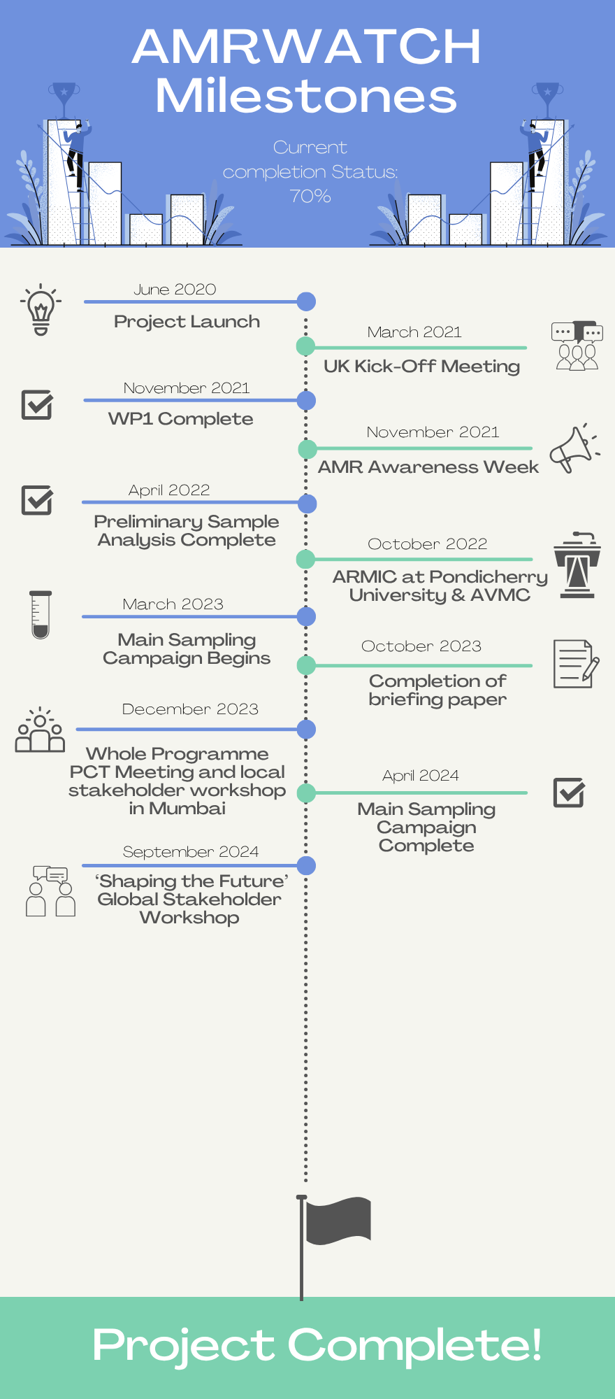 Text description: The title reads 'AMRWATCH Milestones'. The timeline milestones are as follows: June 2020- Project Launch, March 2021- UK Kick-off meeting, November 2021- WP1 Complete, November 2021- AMR Awareness Week, April 2022- Preliminary Sample Analysis complete, October 2022- ARMIC at Pondicherry University & AVMC, March 2023- Main Sampling Campaign Begins, October 2023- Completion of briefing paper, December 2023- Whole Programme PCT Meeting and local stakeholder workshop in Mumbai. April 2024- Main Sampling Campaign Complete. September 2024- 'Shaping the Future' Global Stakeholder Workshop