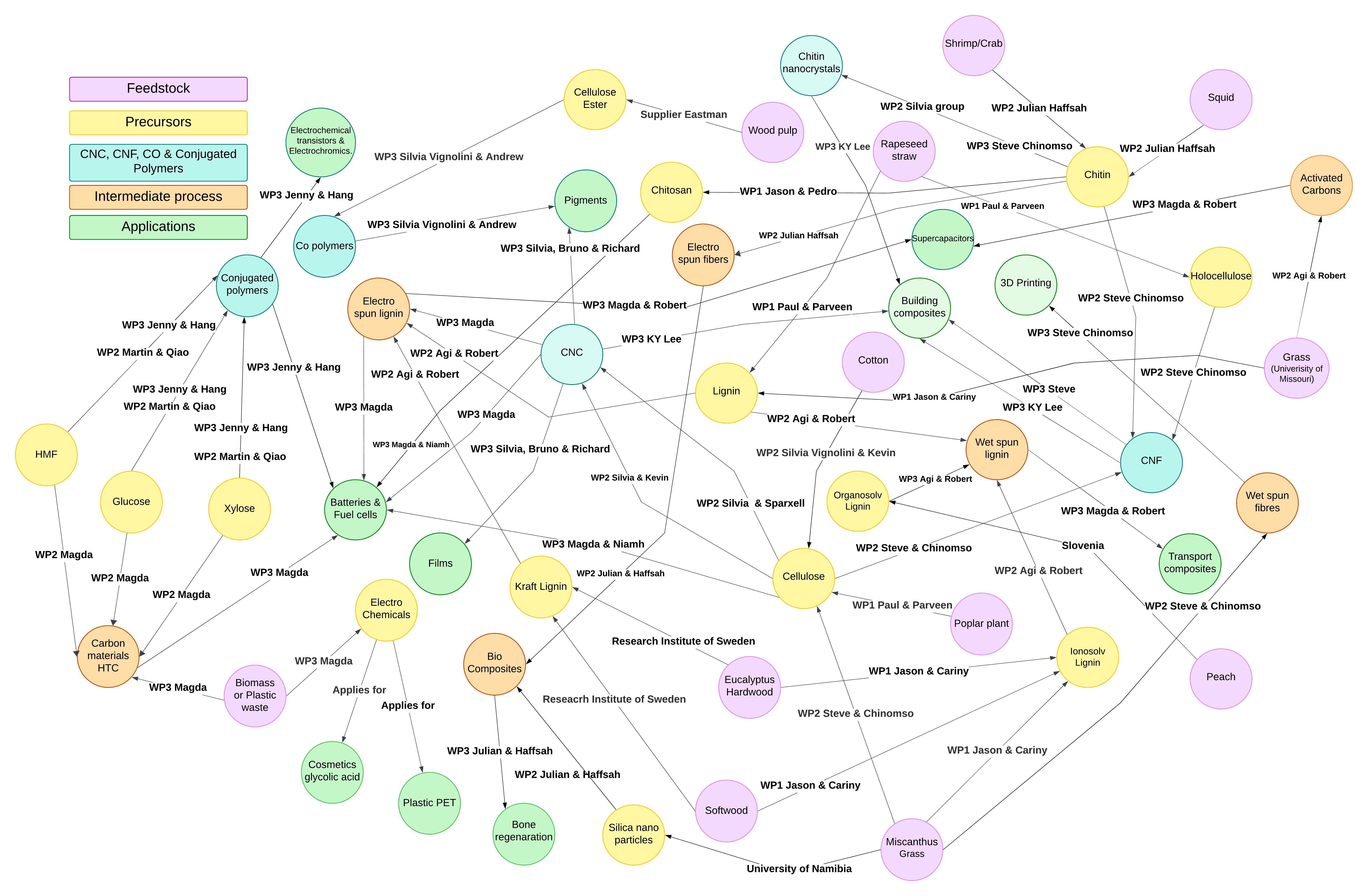 What distinguishes VALUED is its multidisciplinary synergy, as it brings together experts from fields such as biochemistry, materials science, engineering, and computational modelling. This diverse team creates a unique collaborative environment (Fig1: Collaboration Map) that accelerates the development of sustainable materials. Their combined expertise allows them to tackle complex challenges, including extracting valuable molecules from waste, designing bio-inspired materials, and advancing large-scale manufacturing processes like 3D printing, roll-to-roll printing, and fibre spinning.