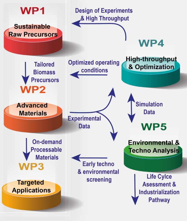 The non-linear WP structure features a parallel set of complementary activities that provide iterative feedback, ensuring continuous refinement of our approach. This innovation is building a strong foundation for creating reproducible and scalable chemicals/precursors, which will evolve into advanced materials derived from bio-waste. Throughout the process, we are optimising simultaneously for both performance and sustainability.