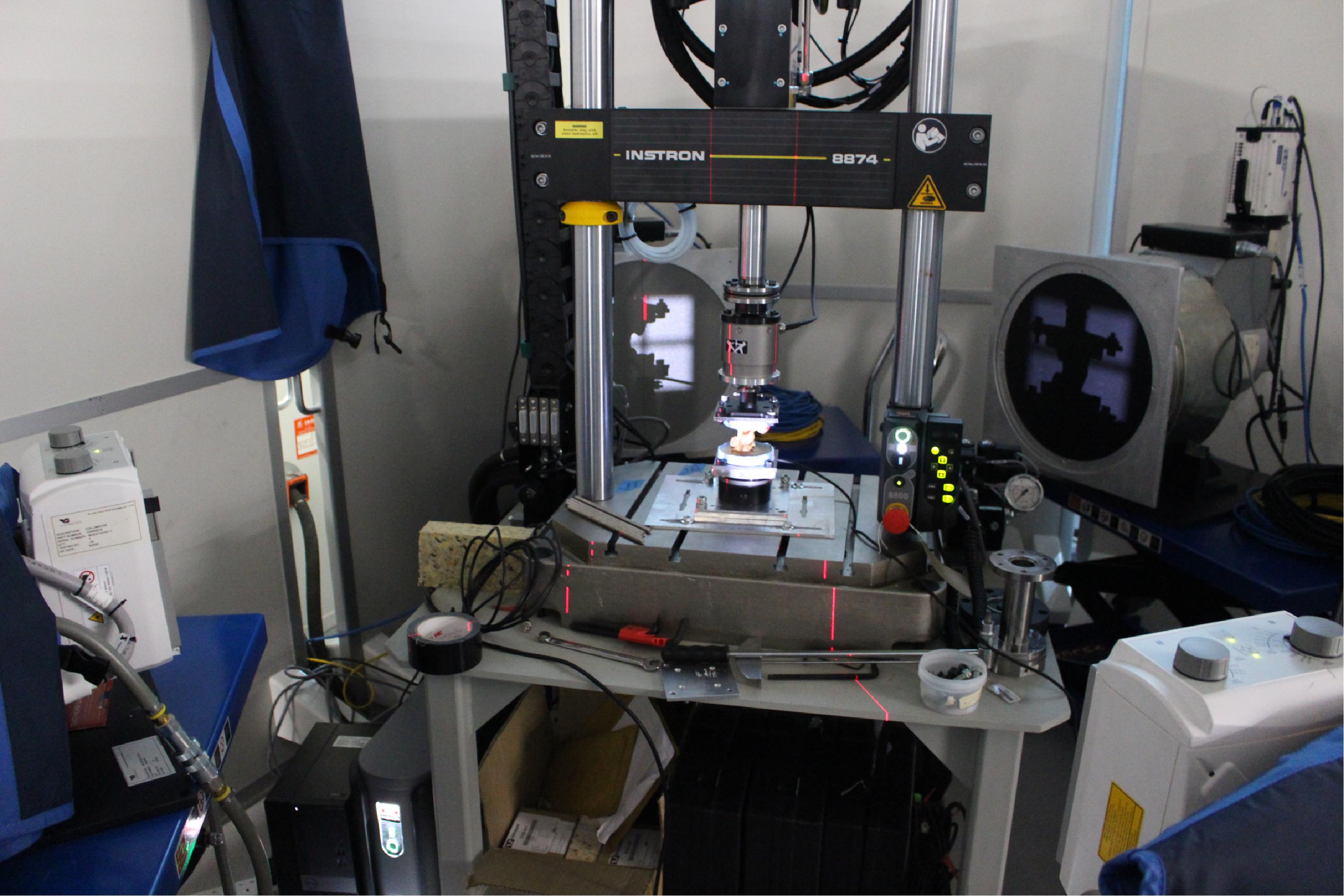 An internationally unique capability, this system allows for the simultaneous collection of 2 x-ray images at high frequencies digitally via high speed cameras. The biplanar x-ray system is currently being developed for three-dimensional digital reconstruction of the event of interest by performing radiostereometric analysis (RSA) with unprecedented sampling rates using RSA Biomedical’s UmRSA® software.