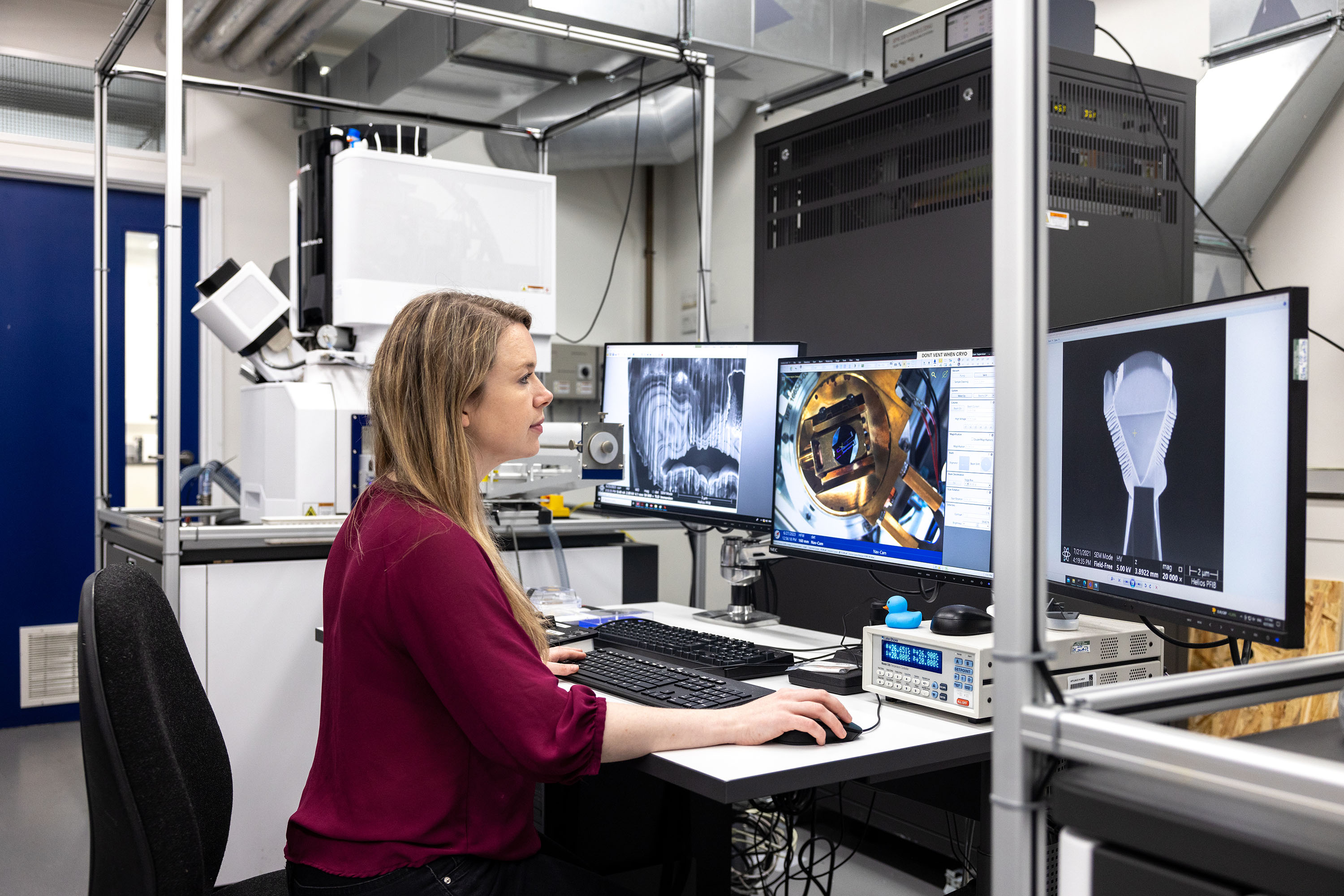 The high current plasma source allows high-volume milling at rates orders of magnitude greater than that of conventional gallium sources, giving significant improvements in throughput. The system is equipped with a cryo-capable stage and cryo manipulator, which will allow the lift out of materials that require a constant cryogenic temperature, such as frozen liquid/solid interfaces.