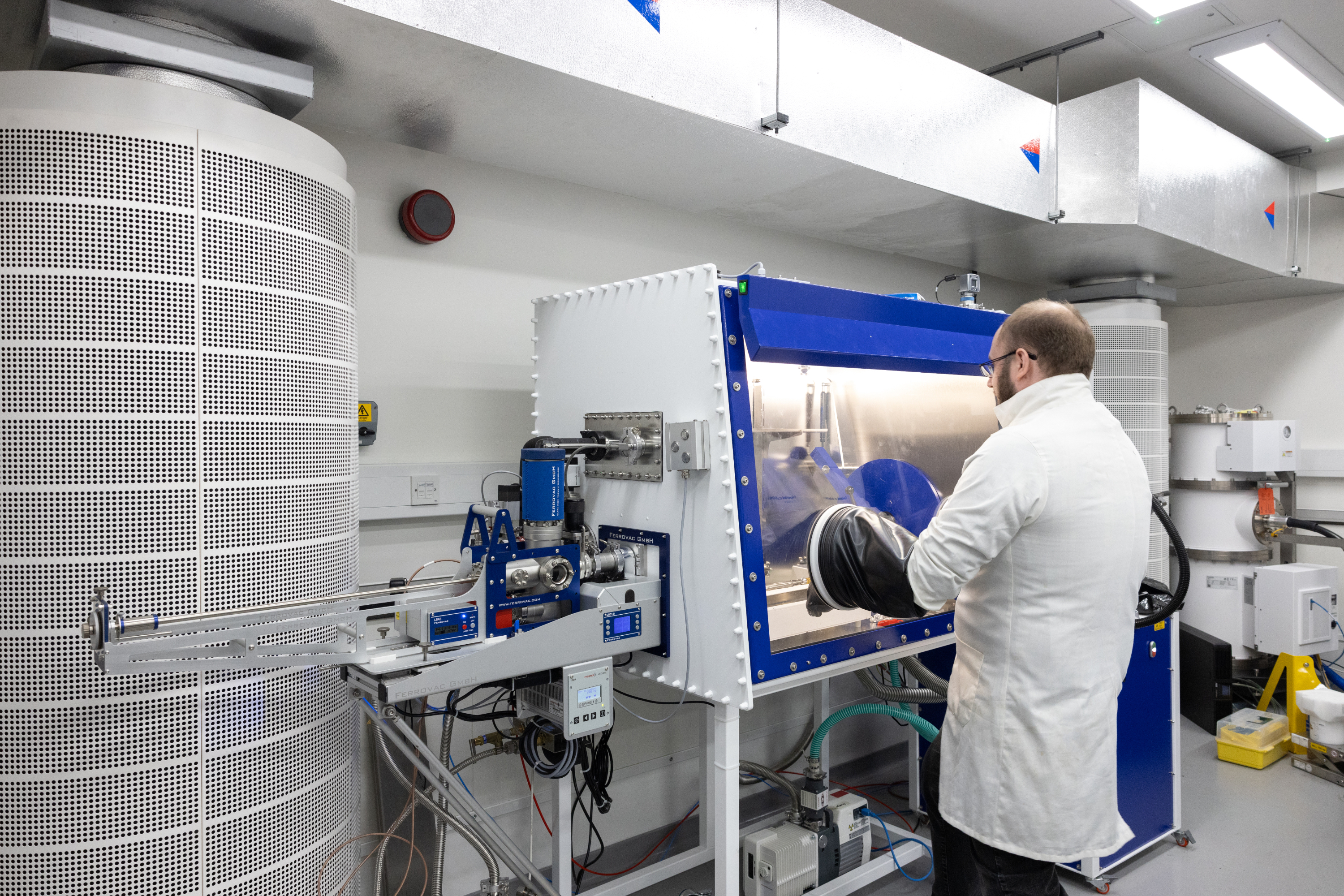 The glovebox system consists of a chamber with an inert (N2) atmosphere, a large load-lock for large samples and materials and a dock for a FerroVac cryo/vacuum transfer suitcase.