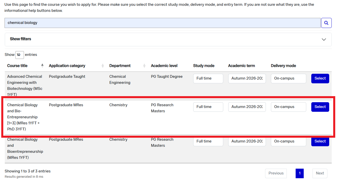 If you have an MSci, MSc or MChem then you will need to apply to the option above, Chemical Biology and Bio-Entrepreneurship [1+3] (MRes 1YFT + PhD 3YFT) via the 'Postgraduate MRes' course type (see above).