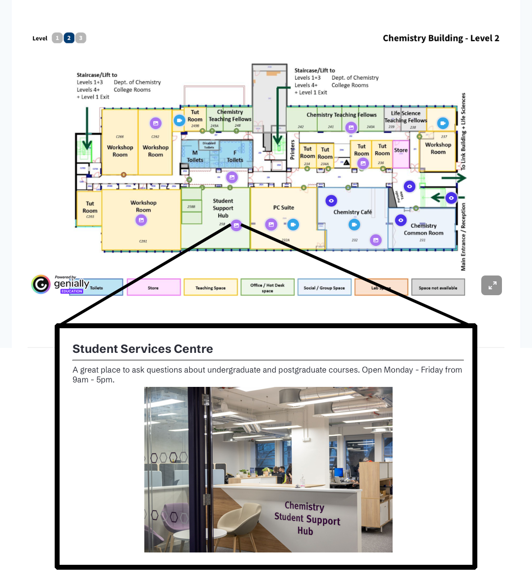 Perhaps unexpectedly, one of the most heavily used aspects of the website is the interactive ‘Finding Your Way Around’ map. Intended to help navigation and space familiarisation, using Genially allowed us to embed photos, 360° panoramas, and videos of students talking about the nature of teaching activities in areas to get a sense of the physical environments and their purpose. We’ve found this has had wider benefits for inclusivity, allowing students and staff to find their way around more quickly, even if they are unable to visit the campus in advance. It has also been useful for students with disabilities to support space familiarisation; confidence with what to expect from spaces can be particularly useful for neurodivergent students [5].