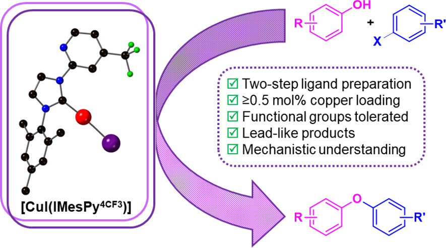 Diaryl and heteroaryl ethers are important and common motifs in drug discovery and agrochemicals. Here we present a catalytic system for the copper catalysed arylation of phenols with aryl halides. Bidentate N-heterocyclic carbene ligands provide a well-defined catalytic system that enable low loading of copper in effective coupling reactions (0.5 mol% Cu or lower). The reaction scope of aryl iodides and aryl bromides is developed, that is tolerant of functional groups and a library of biaryl ethers with lead-like properties is prepared. The presence of excess ligand (in a 1:3 ratio) is shown to be optimal to prevent catalyst degradation, presumably by avoiding decomplexation of the ligand. This is also supported by the catalytic results obtained with pre-formed copper complexes. The kinetics of the reaction are examined and shown to be first order in copper, supportive of a well-defined catalyst species, first order in phenol and aryl iodide, and zero order in base under the developed conditions. Computational studies performed using Minnesota MN15-L parametrisation method support an oxidative addition–reductive elimination pathway. Reductive elimination would be turnover limiting and occurr through an intimate ion pair intermediate.