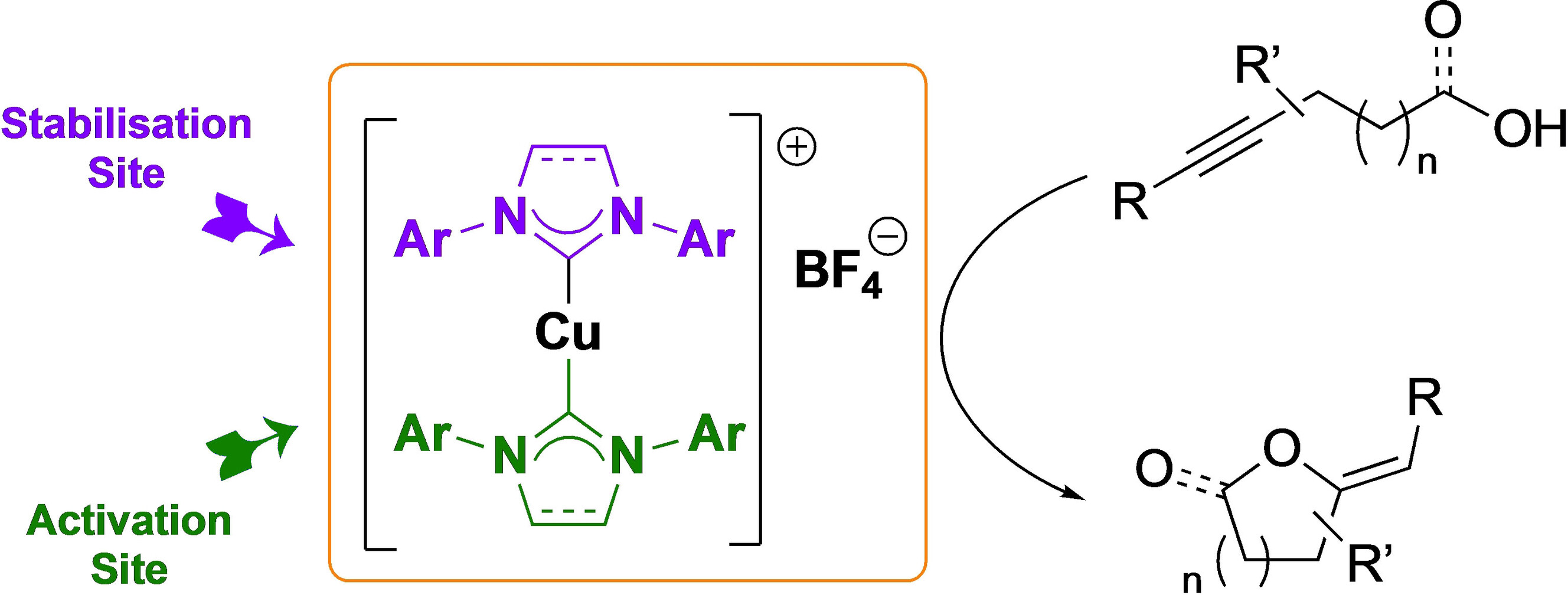 The cyclisation of alkynyl alcohols and carboxylic acids in the presence of a [Cu(NHC)2]X complex is reported. The reactions were carried out in technical grade toluene in the presence of air with a catalyst that is readily accessible. N-Heterocyclic carbenes are recognised for stabilising metal centres in a range of oxidation states, and this work further supports that NHCs can also be used as activation sites in air and moisture stable yet active catalysts.