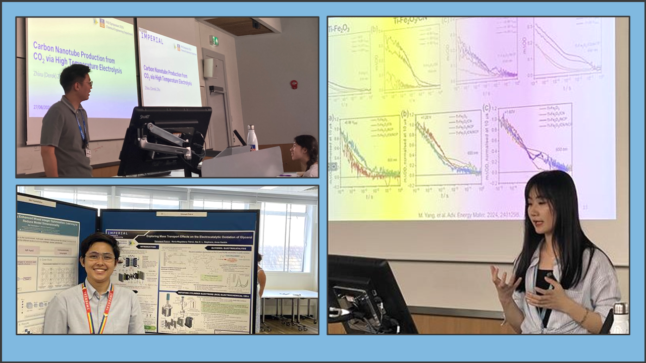Well done Kloy, Derek and George for first attending the 38th Topical Meeting of the International Society of Electrochemistry and then the Electrochem2024 Conference, both in Manchester. At Electrochem2024, Kloy talked about 'Electrochemical oxidation of glycerol on platinum electrodes', Derek presented progress with 'Carbon nanotube production from molten Li2CO3 via high temperature electrolysis' and George reported the results from 'Outdoor testing of an up-scaled photoelectrochemical water splitting reactor in South Africa'.