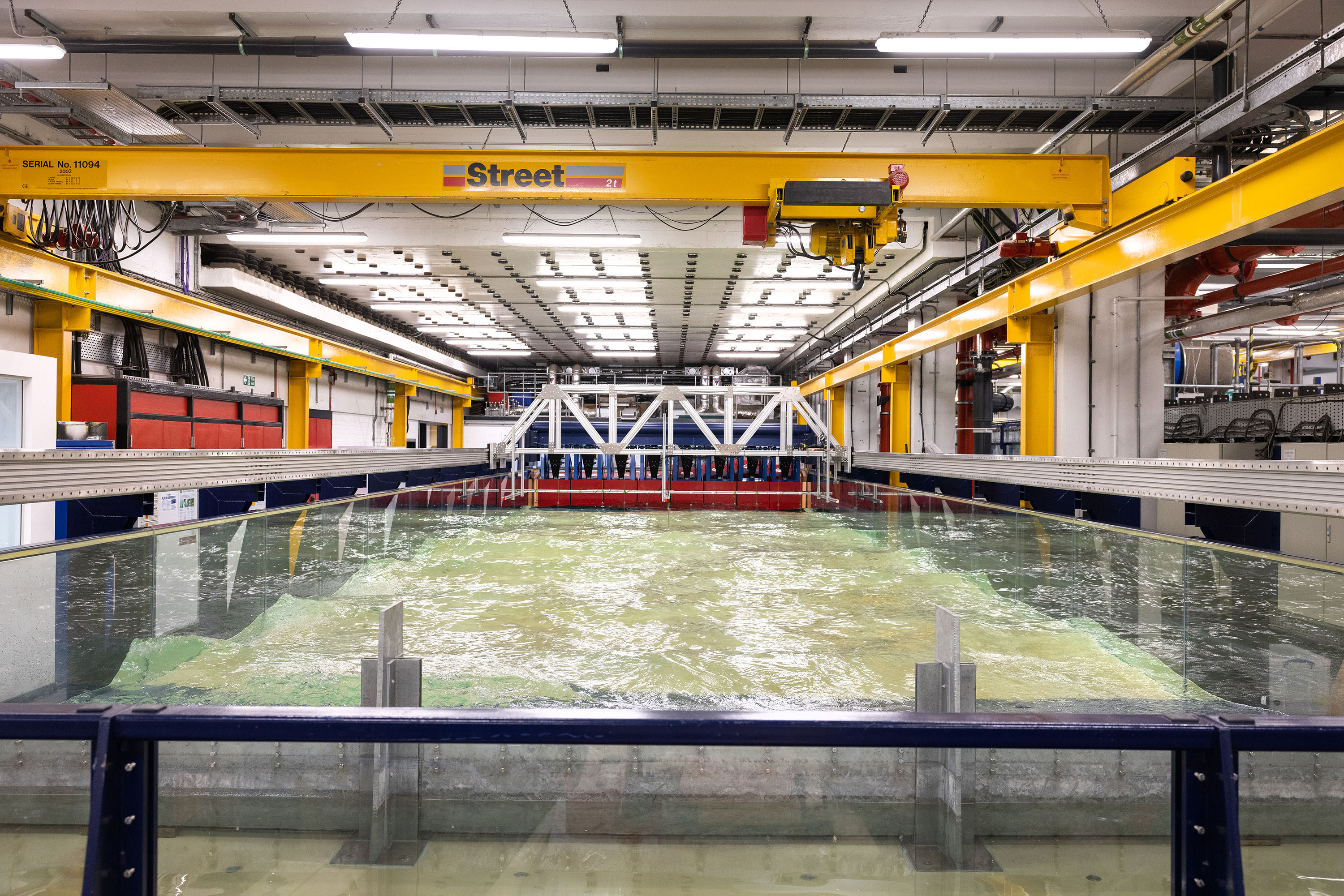 The shallow-water wave basin is a specialized facility for coastal research. It comprises of 8 large piston-type wave paddles and a perforated parabolic beach enhanced with geotextile material. Its plan dimensions are 26m by 6m and the water depth at the paddle can vary between 0.4m and 0.8m. The bed of the basin is equipped with mounts that allow the installation of a wide range false beds. The adjustable bed can be flat, sloping (1:250-1:5) or complex (e.g. trapezoidal) and can be fixed or mobile (sand). The wave basin can generate long- and short-crested waves as well as currents. The facility generates currents as a recirculation flume using a constant head with natural flow. It is also equipped with a high-speed, digitally controlled carriage that spans the full width of the tank. As such, this versatile facility can be used as a wave basin to study combined wave-current wave basin, a towing tank with maximum depth of 1m or a recirculating flume. Present research in the shallow water wave basin includes coastal hydrodynamics, wave-structure interaction (e.g., breakwaters), testing of marine renewable devices as well as beach evolution.