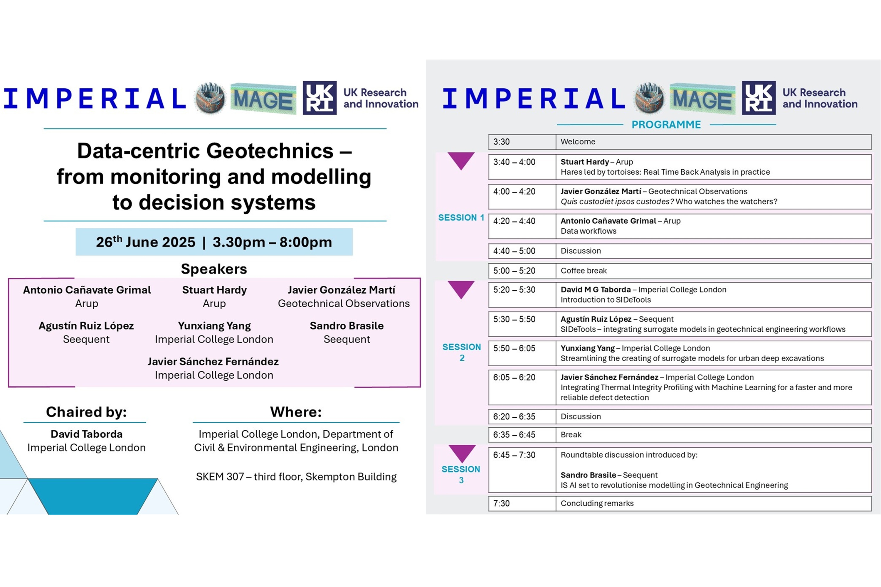 SIDeTools - Smart Infrastructure Design Tools is a research project funded by UKRI through an Impact Acceleration Account (EP/X52556X/1) that took place at MAGE between November 2023 and June 2025. The research team included Dr. Agustin Ruiz-Lopez, Dr. Aikaterini Tsiampousi and Dr. David M G Taborda, supported by our industrial partners Seequent, Arup, Geotechnical Observations and Laing O'Rourke.