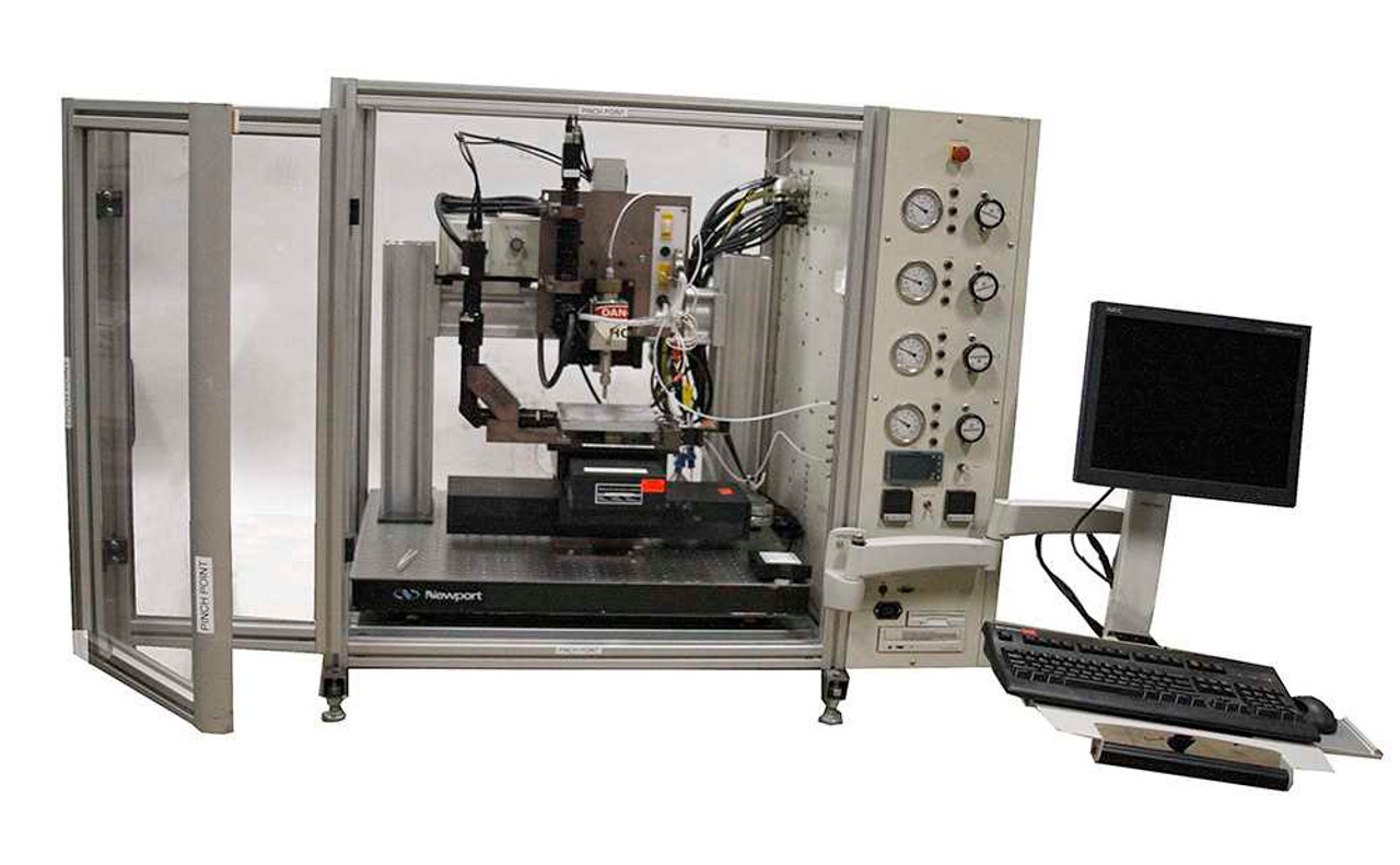 The system is capable of arbitrary printing resolution and direction and complex print job definition through scripting and control of multiple process functions (e.g. valves, light sources, etc.). A CCD camera is included for drop observation as well as a CCD camera with coaxial illumination for substrate observation.