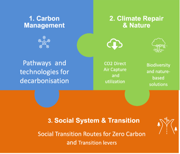 The Centre builds on the framework of activities developed under Imperial College’s Transition to Zero Pollution initiative. It brings together researchers from the Faculties of Engineering, Natural Sciences and the Business School and in partnership with the Global Challenge Institutes for Energy and Climate (Energy Futures Lab, Grantham Institute – Climate Change and Environment). Our activities are based on three research pillars: Carbon Management and Decarbonisation (Energy and Transport), CO2 Removal (Technology and Nature-based Solutions), and Socio-economic and Policy work. Our current work includes five projects sitting within these three themes.