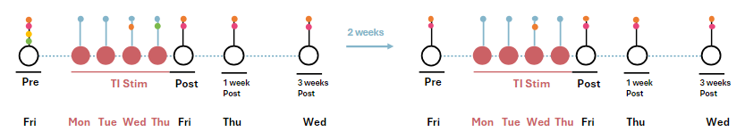 The study will consist of 16 visits spanning 3 months. This includes 2 weeks of TI stimulation separated by a 6-week gap including a 1-week and 3-week follow-up assessment. The two stimulation weeks are also preceded by a baseline assessment. See image below for a visual representation of the study schedule.