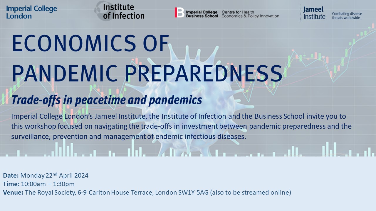 On 22nd April 2024, the Jameel Institute, the Institute of Infection, and the Centre for Health Policy and Innovation joined forces to collaboratively organise and host an exciting one-day discussion at the esteemed Royal Society on ‘The economics of pandemic preparedness: Trade-offs in peacetime and pandemics’.