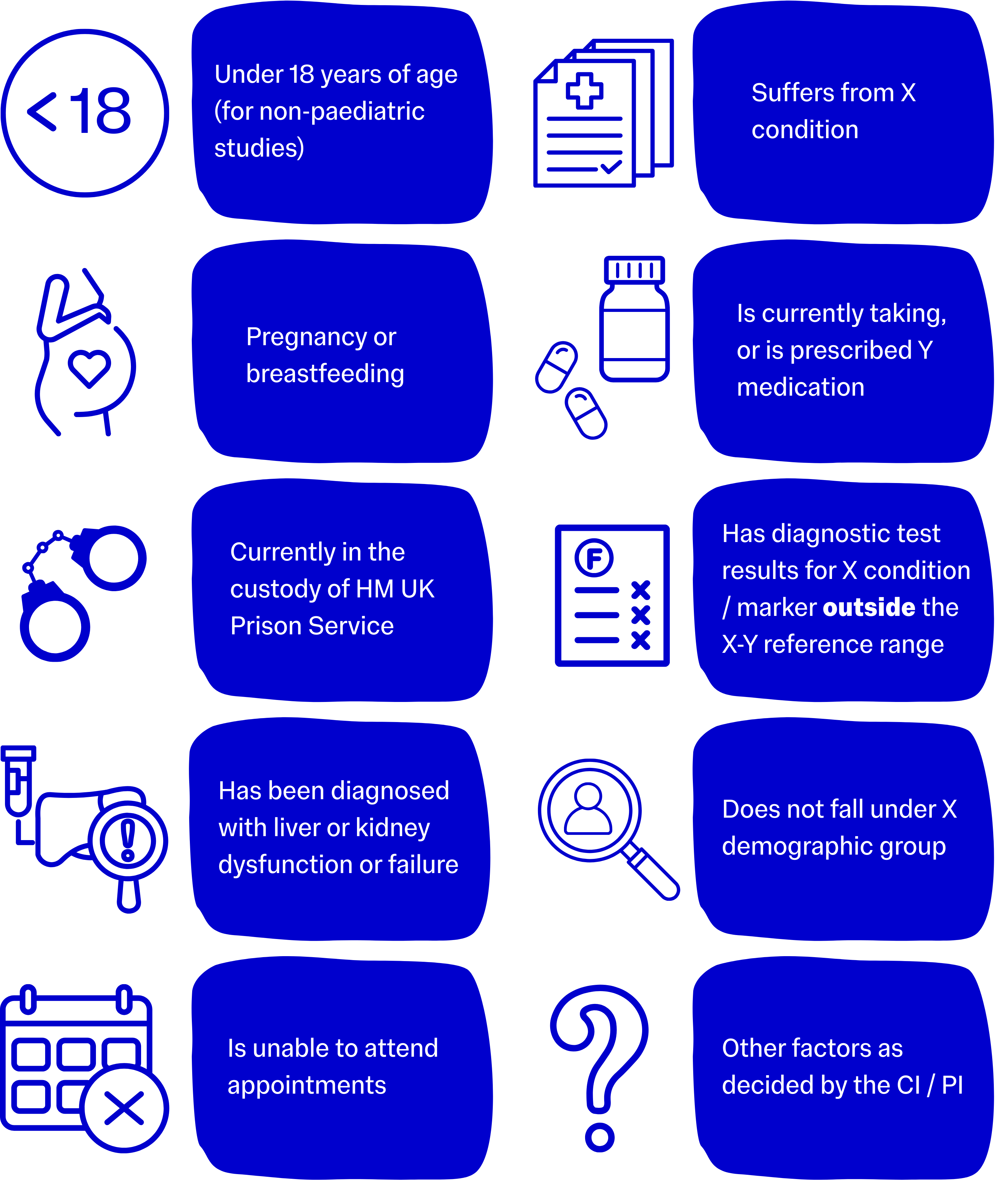- Appointment 1 – Screening – Participants are screened for enrolment using measure A and measure B. Bloods will be taken to assess measure C.
