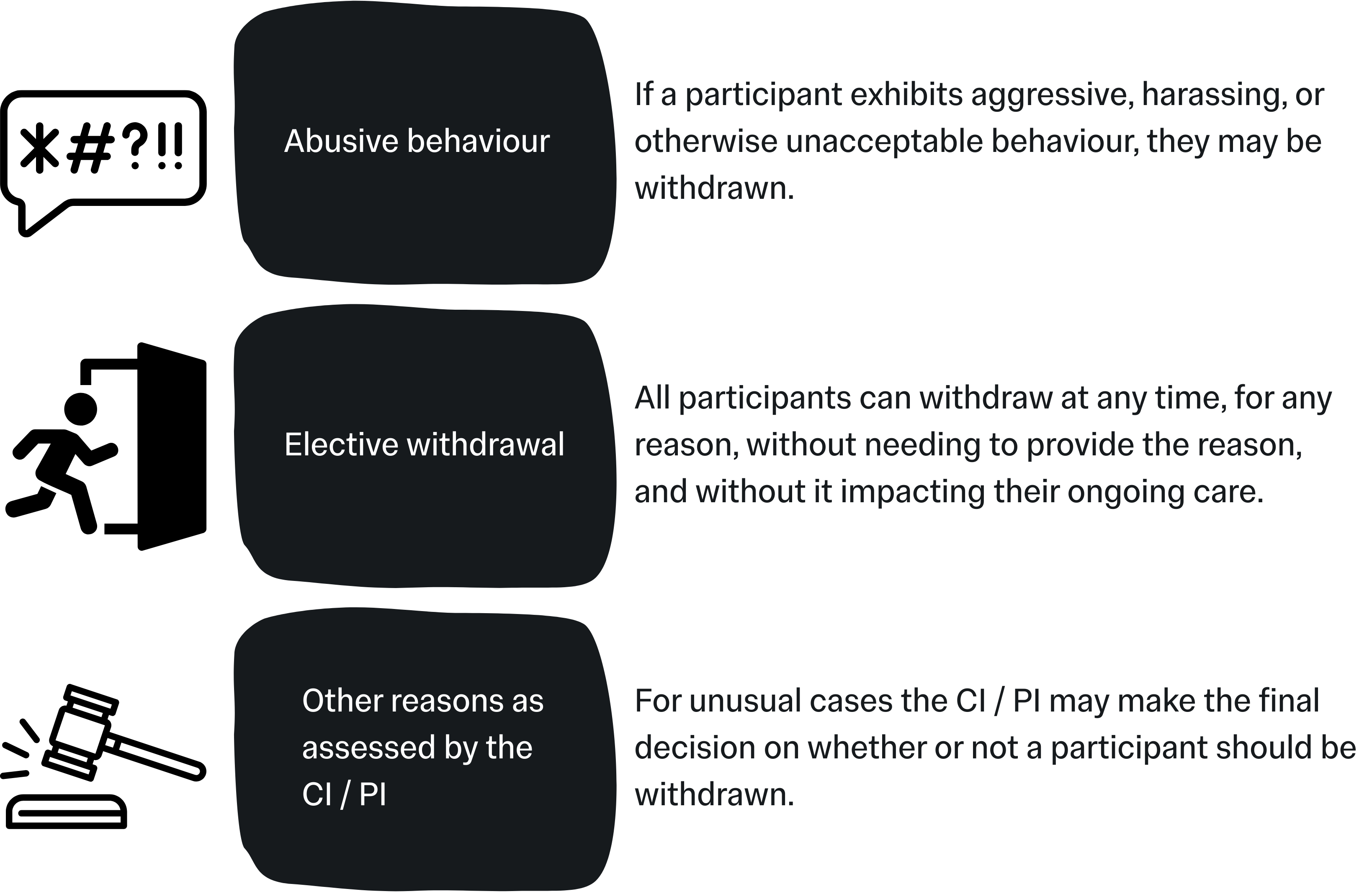 You will need to keep a record of any and all incidents that fall under the above definitions, which should be categorised in a logical and practical manner, additionally classed as “serious” or “non-serious”, and you should organise regular (ideally monthly, depending on how many participants you see per month) meetings that include your CI / PI to discuss any new incidents. Your CI / PI will then be able to assess how the incidents were responded to, if they have been categorised and defined correctly, if any further reporting needs to occur, and will sign-off on them if they are happy with the procedures to date. When recording incidents involving participants it is vital to note the anonymised participant ID of the participant involved, not their actual name.