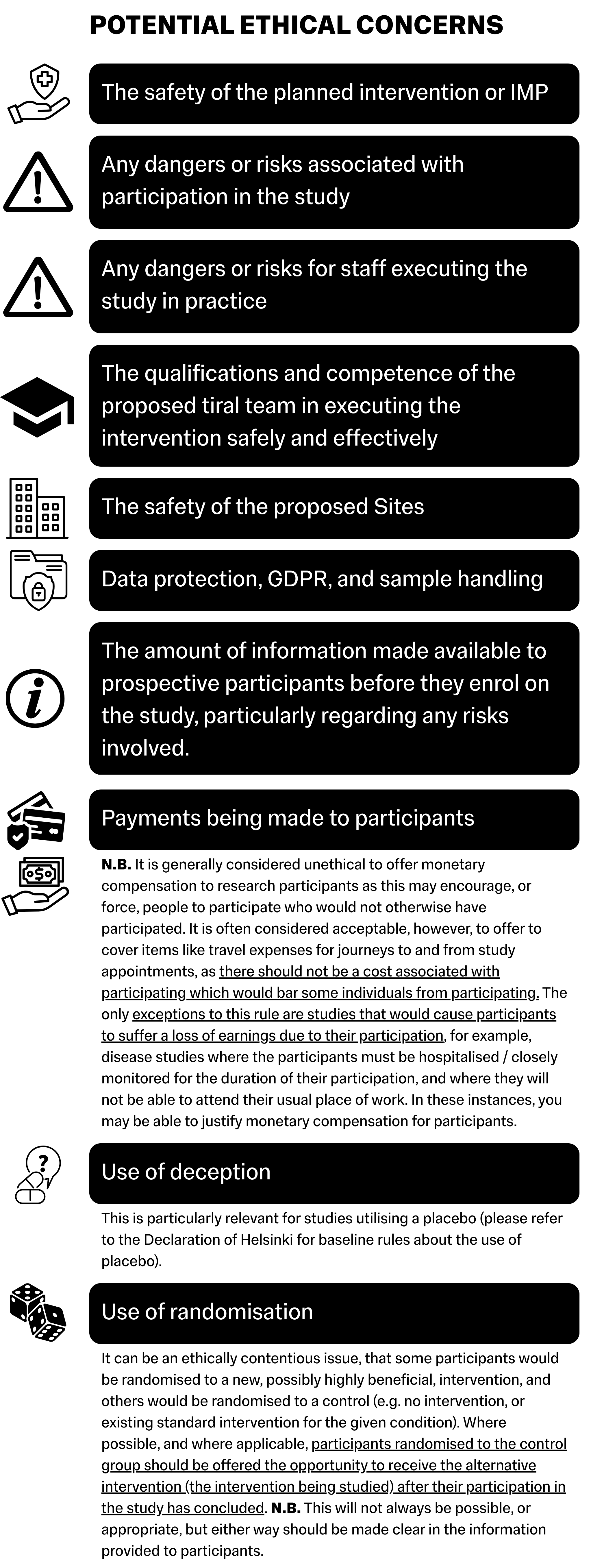 It should be noted that some ethical concerns are never acceptable and cannot be sufficiently mitigated. The main items that may reach this threshold relate to participant safety and the safety of any proposed intervention, up to and including risk to life. In these instances, the project should go through other trial pathways such as cadaveric studies or animal studies before a proposing a clinical trial involving human participants.