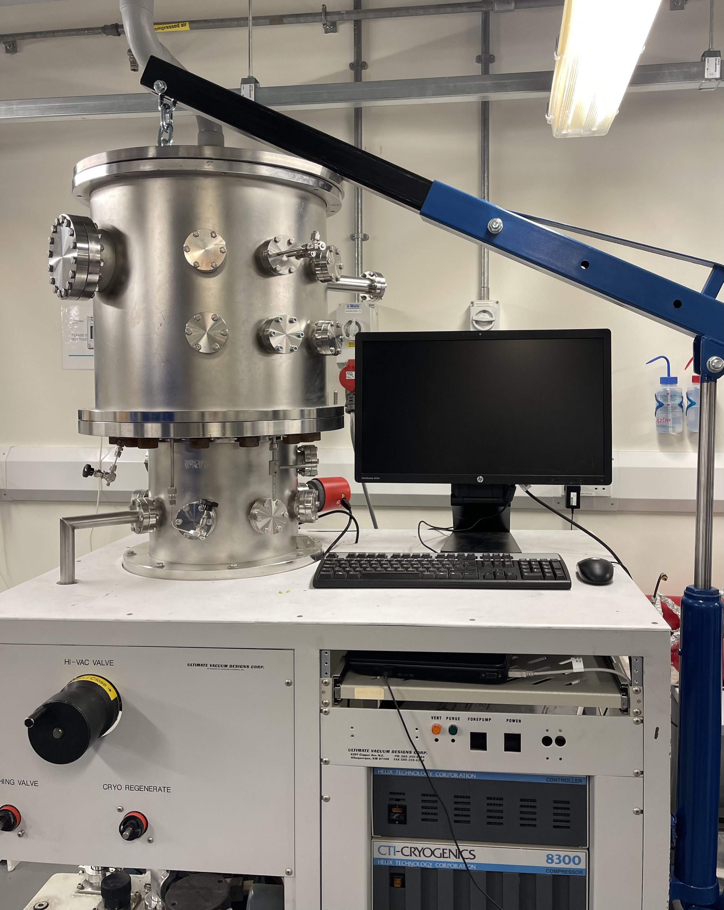The Maxwell chamber functions in a similar way to Boltzmann. Composed of a single cylindrical chamber roughly 0.5 m in diameter and 0.5 m in length, it relies on a two-stage pumping system to achieve background pressure levels conducive to Electric Propulsion (EP) testing. In this case, a Trivac D16 A rotary vane pump is used in combination with a CTI Cryogenics Cryo-Torr 8 cryopump.