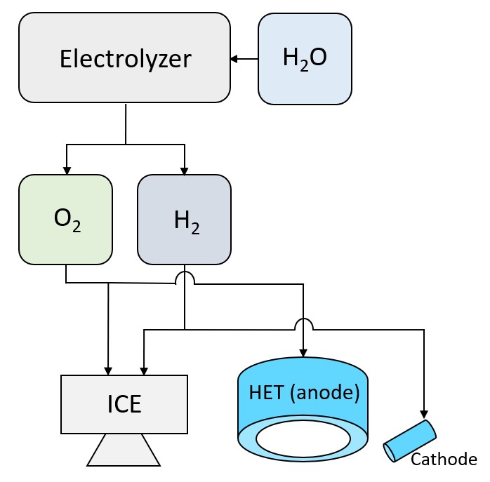 Encouraged by these promising properties, the IPPL are carrying out research and development for a dual-mode chemical-electric propulsion architecture that uses water as a unified propellant (see Figure 1). When higher thrust manoeuvres are required, the dual-mode system relies on a MEMS based bi-propellant chemical thrust, the Iridium Catalyzed Electrolysis (ICE) thruster. When high mass utilization efficiency is important the dual-mode system has a HET-based EP branch which can be implemented in one of two ways. The HET can either operate using the products of water electrolysis, i.e. oxygen to the anode and hydrogen to the cathode, or using water vapor for the anode and an inert gas for the cathode.
