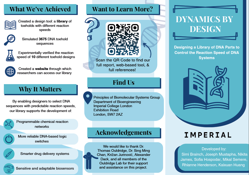 We’re pleased to share that our undergraduate project group has successfully completed their 2024/25 project, Dynamics by Design. Their work explores a novel approach to tuning DNA strand displacement reaction rates by introducing base-pair mismatches into toehold regions. Using a modular design and in silico tools like NUPACK, they created a comprehensive database of toehold variants spanning a wide range of kinetics. This work helps overcome modelling limitations and adds a valuable tool to the molecular programming toolkit.