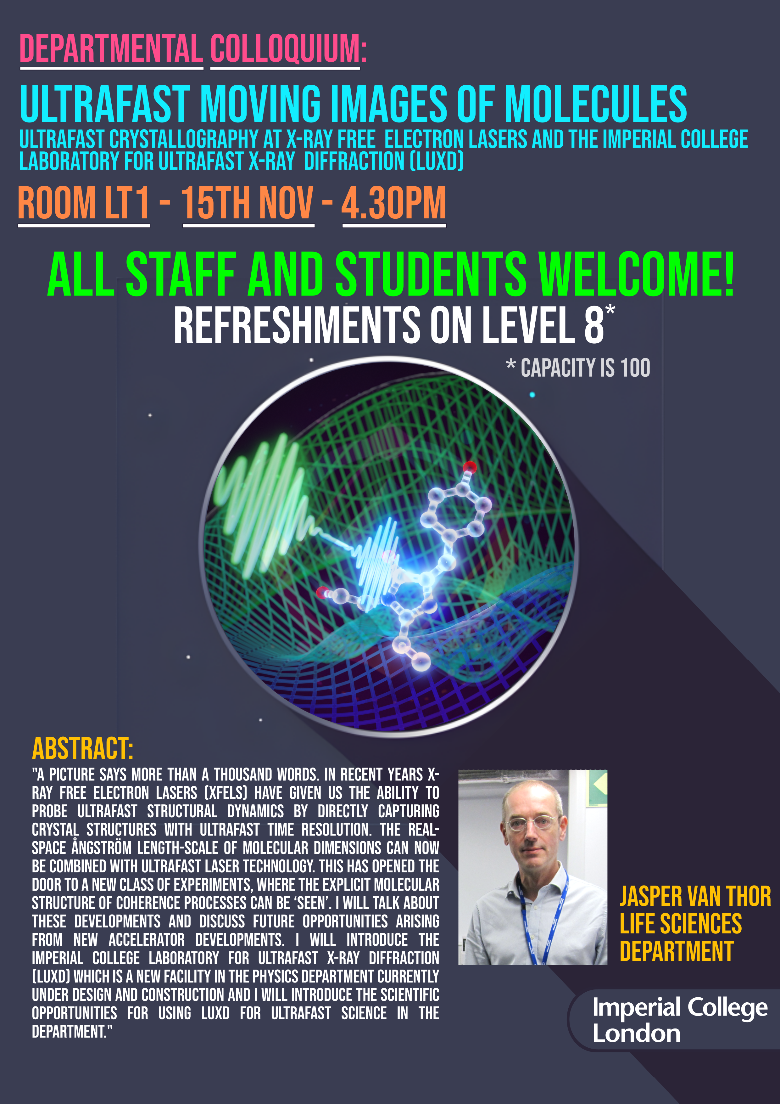 A picture says more than a thousand words. In recent years X-ray free electron lasers (XFELs) have given us the ability to probe ultrafast structural dynamics by directly capturing crystal structures with ultrafast time resolution. The real-space Ångström length scale of molecular dimensions can now be combined with ultrafast laser technology. This has opened the door to a new class of experiments, where the explicit molecular structure of coherence processes can be ‘seen’. I will talk about these developments and discuss future opportunities arising from new accelerator developments. I will introduce the Imperial College Laboratory for Ultrafast X-ray Diffraction (LUXD) which is a new facility in the physics department currently under design and construction and I will introduce the scientific opportunities for using LUXD for ultrafast science in the department.