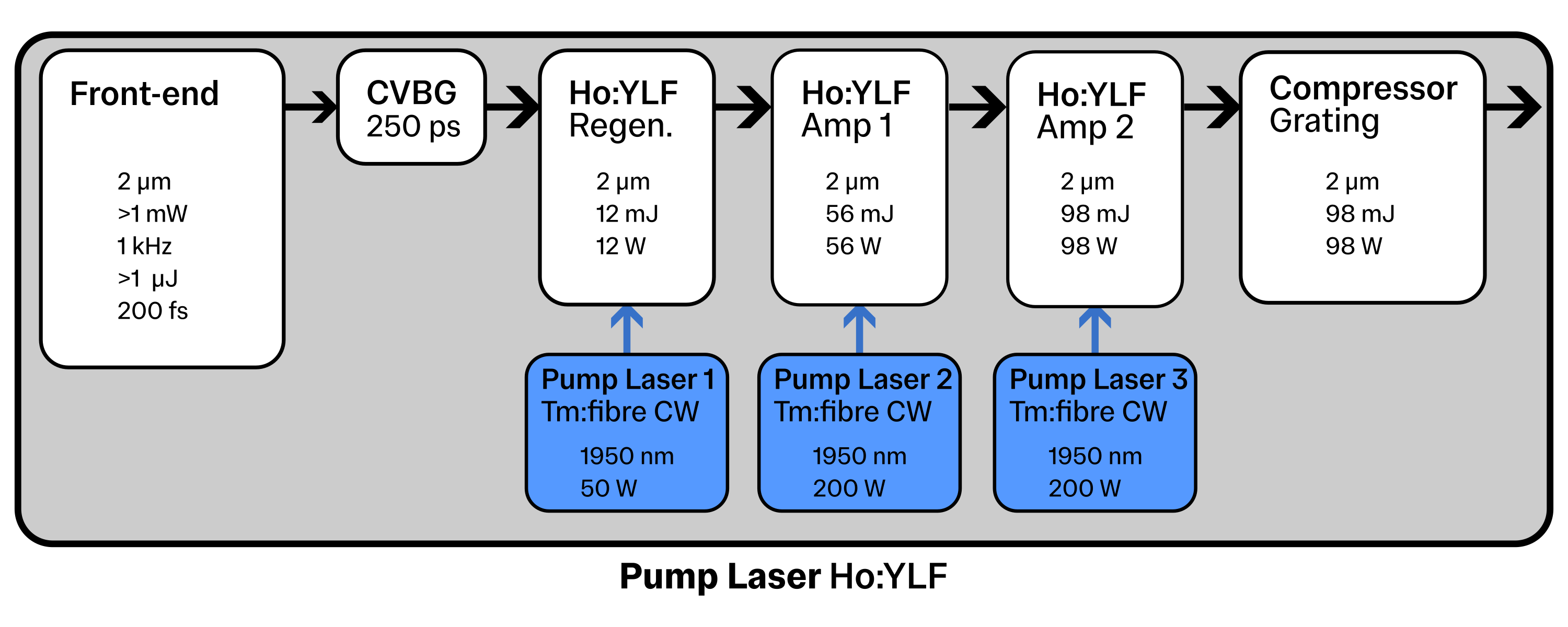 This system begins of an initial down converting of the Ytterbium 1030 nm oscillator. The low pulses energy femtosecond pulses are stretched using Chirped Volume Bragg Gratings (CVBG) to 250 ps to form the seed of the amplifiers. This consists of one regenerative amp and two booster amps, each stage is pumped by continuous wave (CW) fibre coupled Thulium lasers. The amplifiers take the initial seed pulse energy of ~1 μJ and raise it to >98mJ or 100W . The high energy stretched pulses are then recompressed to 2.4 ps using a grating compressor.