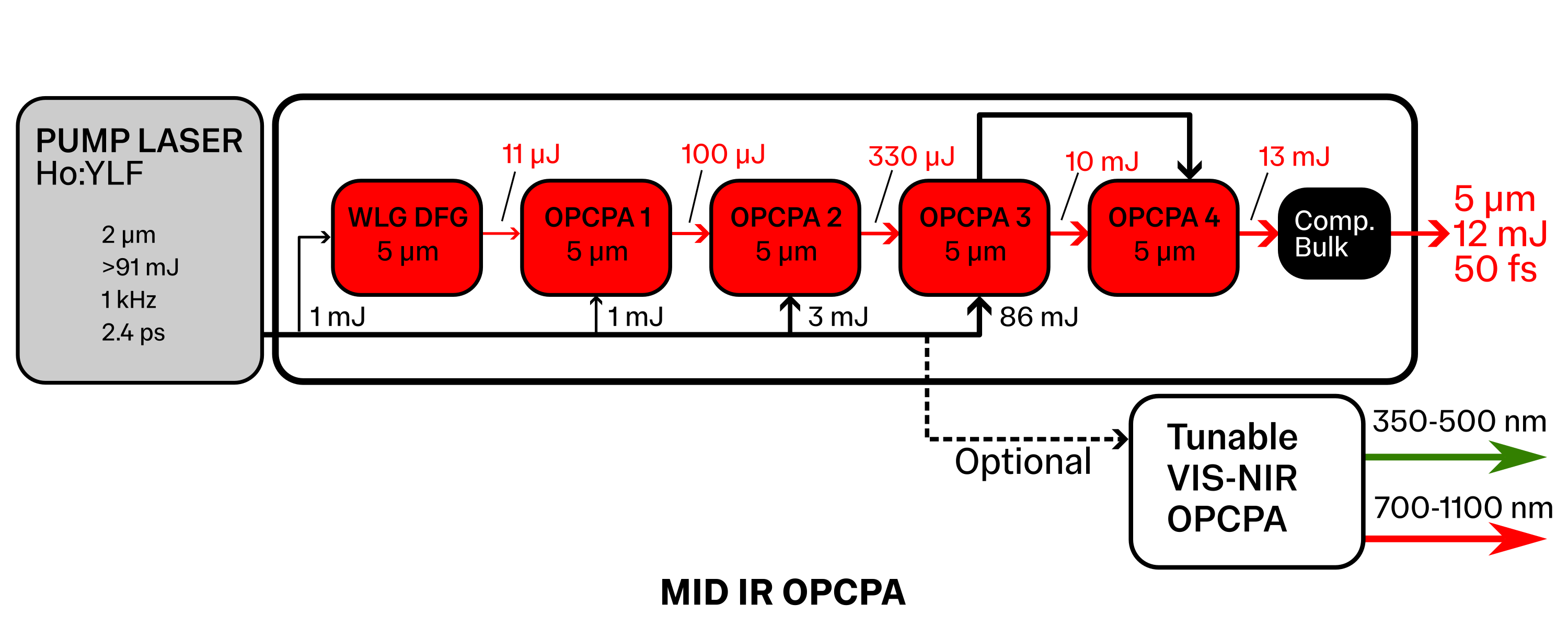 The Optical Parametric Chirped Pulse Amplification (OPCPA) laser is pumped by the >91 mJ 2 μm 2.4 ps pulses of the Ho:YLF pump laser. Initially a proportion of the pump used to drive White Light Generation (WLG) and the Difference Frequency Generation process to make the 5 μm seed pulses. The pulses are then amplified by four sequential OPCPA stages which bring the pulse energy from 11 μJ to >13 mJ. These high energy pulses are then compressed using a bulk media compression for a final high power 50 fs output.