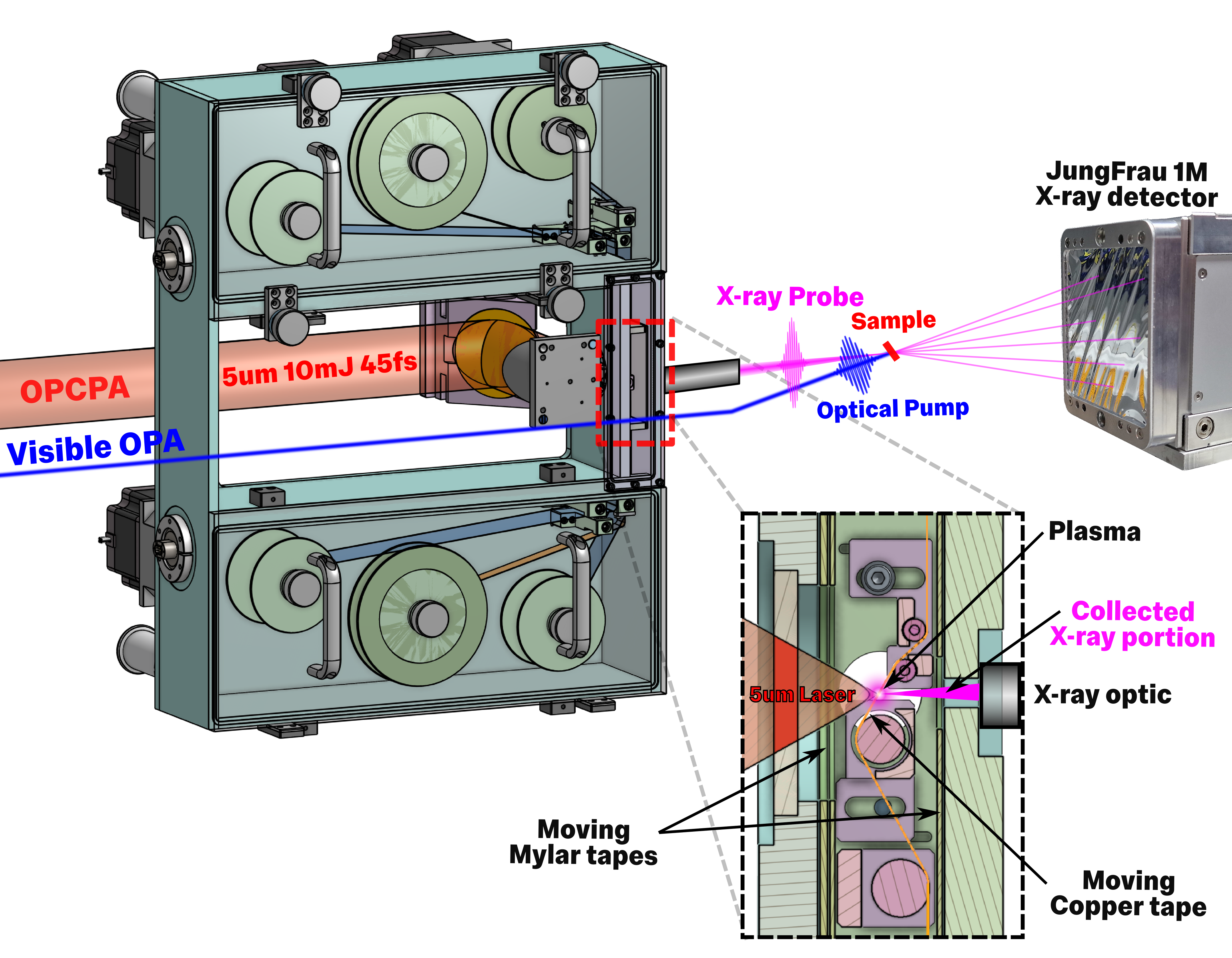 The laser is focused tightly down onto a thin (~20 μm) moving copper tape. Electrons are ripped out of the copper tape every half cycle of the intense electric field of the laser, these electrons are then accelerated away from the tape into the surrounding vacuum. Once time passes and direction of the oscillating electric field reverses the electrons are slowed, stopped and then re-accelerated back towards the copper tape and ultimately slam into the surface. The copper tape is supported at an angle of ~60° to the horizontal in order to maximise this process. During this process the kinetic energy that the electron received from the field is deposited into the copper resulting the formation of a plasma. This copper plasma will primarily radiate at its characteristic X-ray transition of Kα (8.04 keV) but a smaller portion at Kβ (8.9 keV) as well as a small portion of Bremsstrahlung radiation. Due the laser driven nature of the plasma generation mean that the plasma, and therefore the X-ray emission for the approximate duration of the laser pulse as such by using an ultrashort laser pulse will results in a similarly short X-ray pulse emission.