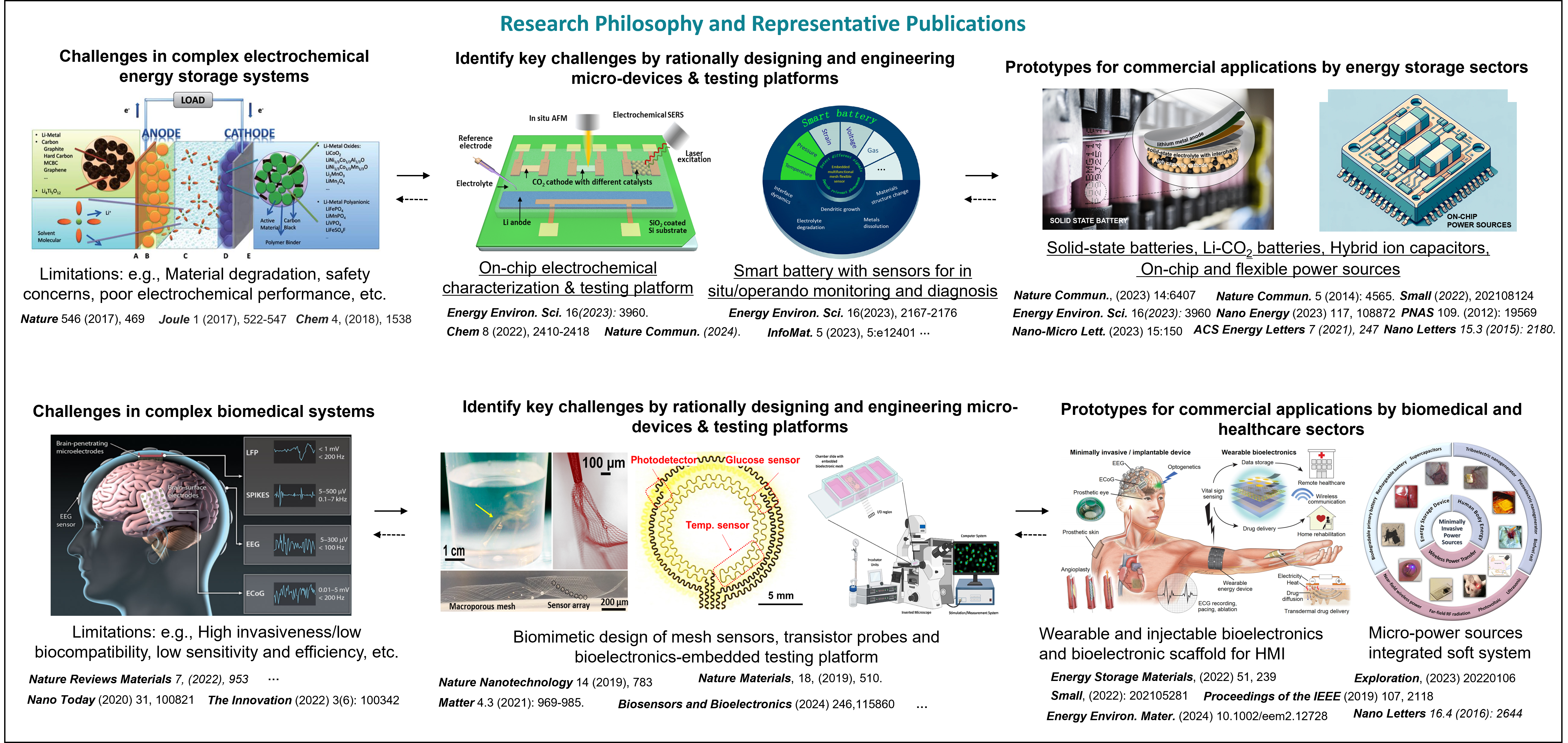 Our research philosophy is to address critical challenges in complex electrochemical and biomedical systems through the rational design of advanced energy storage devices, soft bioelectronic interfaces, and multifunctional sensing technologies. By integrating these technologies into 2D on-chip and 3D soft architectures, we aim to simulate, monitor, and regulate electrochemical and physiological processes, perform root-cause analysis, and propose innovative solutions and optimisation strategies. Ultimately, our goal is to enable reliable operation in mechanically dynamic, biological, and wearable environments, advancing sustainability, next-generation electronics, and healthcare technologies.