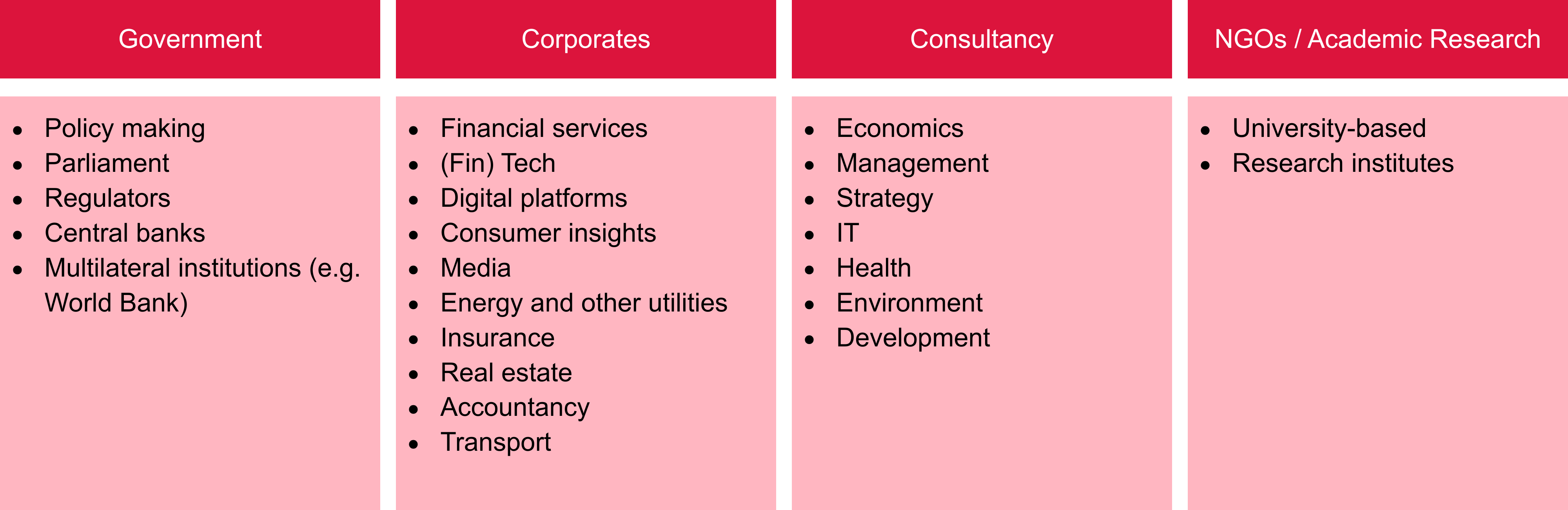 You could work in areas such as technology, finance, consulting, central banks, regulatory bodies, think-tanks, international organisations and more: