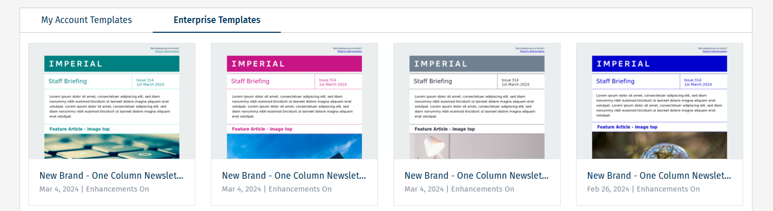 You can find the branded templates in ‘Enterprise templates’. Please ensure you use one of the templates with the Imperial logo - these are the turquoise, pink, grey and blue templates pictured below.