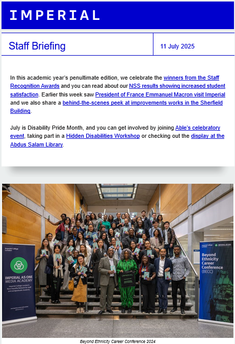 Staff Briefing is Imperial’s all-staff newsletter and is sent out fortnightly on a Friday. It is managed by the Internal Communications team, part of the Communications Division.