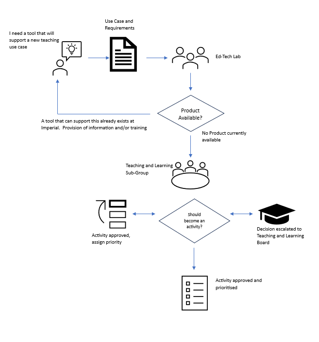 1. Initially discuss your requirements with your EdTech Lab. They may be aware of a product or process already in use in College that could meet your requirements. Alternatively, they may be aware of activities related to the requirements that are under consideration by the relevant Teaching and Learning Board Sub-Group. They can advise accordingly and contribute your requirements to any ongoing activity.