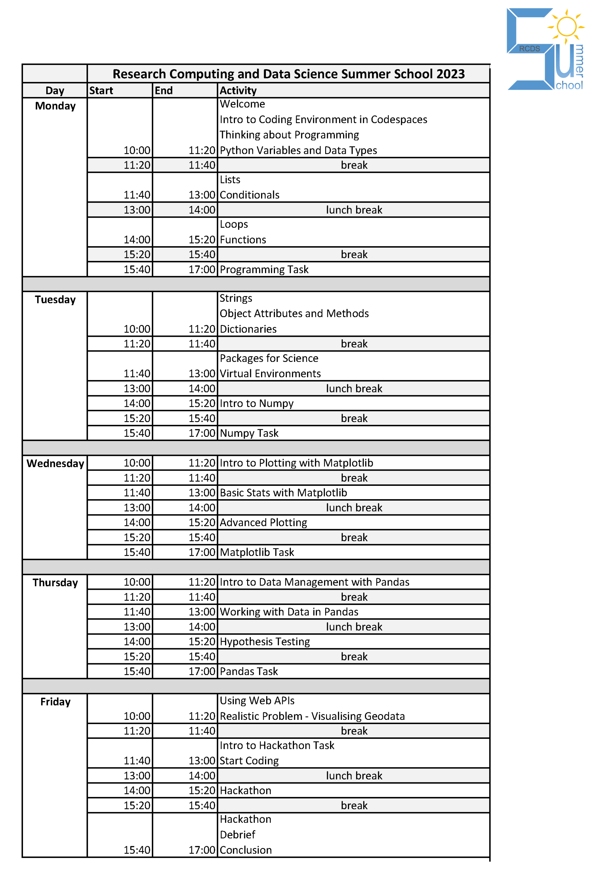 If you are new to programming and would like to gain skills that underpin a wide variety of research projects, join us for five days of hands-on programming and data science activities. You will learn the basis of Python and try out scientific packages that will enable you to complete a realistic project on the last day.