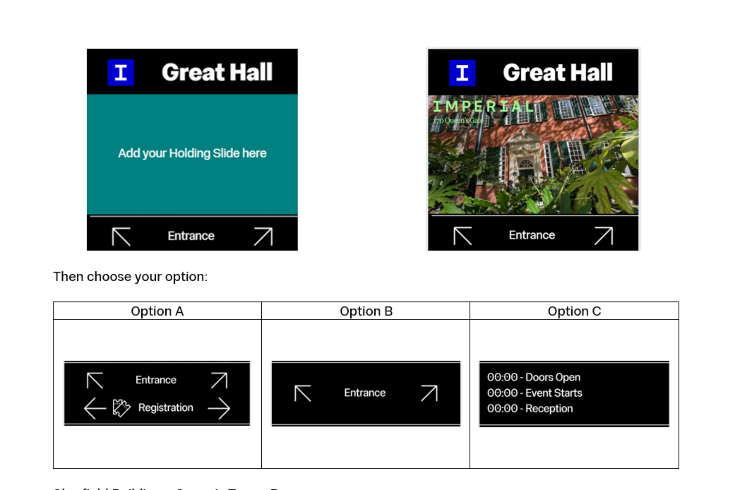 These templates are location specific, currently limited to Great Hall, Queens Tower Rooms, City & Guilds Building LT200 & Sir Alexander Fleming Building G16/G34. Example template options: