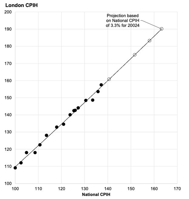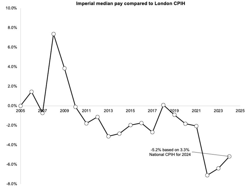 In the figure below we show the update of the value of pay at Imperial compared to 2005, based on the estimated London CPIH at the end of 2024. We estimate this based on the established relationship between London CPIH and national CPIH between 2005 and 2020 (see appendix 1). Note, we will update this element once we receive the latest London CPIH calculation. It should be noted that only a small proportion of the erosion of pay that occurred in 2022 has been made up in the settlements of the last two years.