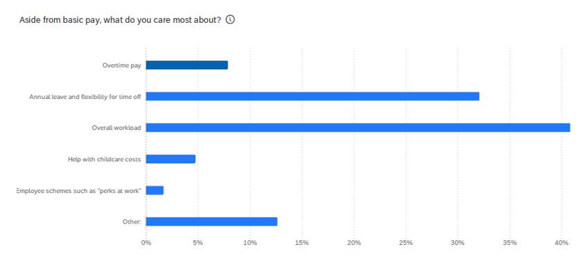 The survey asked additional questions about working conditions and benefits. A recurring theme was workload, which many of the respondents felt was, after pay, the priority:
