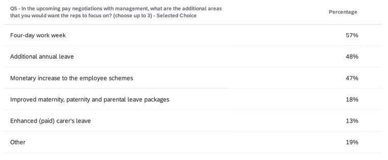 Note that “perks at work” is considered a significant benefit by only a small minority of respondents. Respondents were particularly keen on working towards a 4-day working week and an increased annual leave allowance.