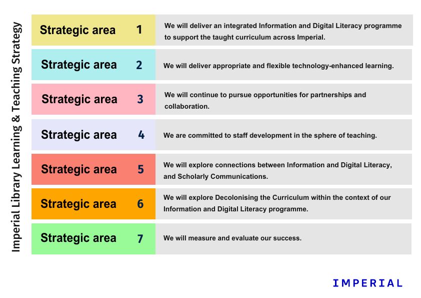 Information and Digital Literacy content is integrated into academic courses across Imperial in cooperation with course teams and is aligned with Imperial's Learning and Teaching Strategy. Content encompasses teaching within the Graduate School Professional Development Programme and a series of elective workshops. We also provide support for researchers through our Scholarly Communications Management Team. Our NHS offer presents IDL as it relates to workplace realities.