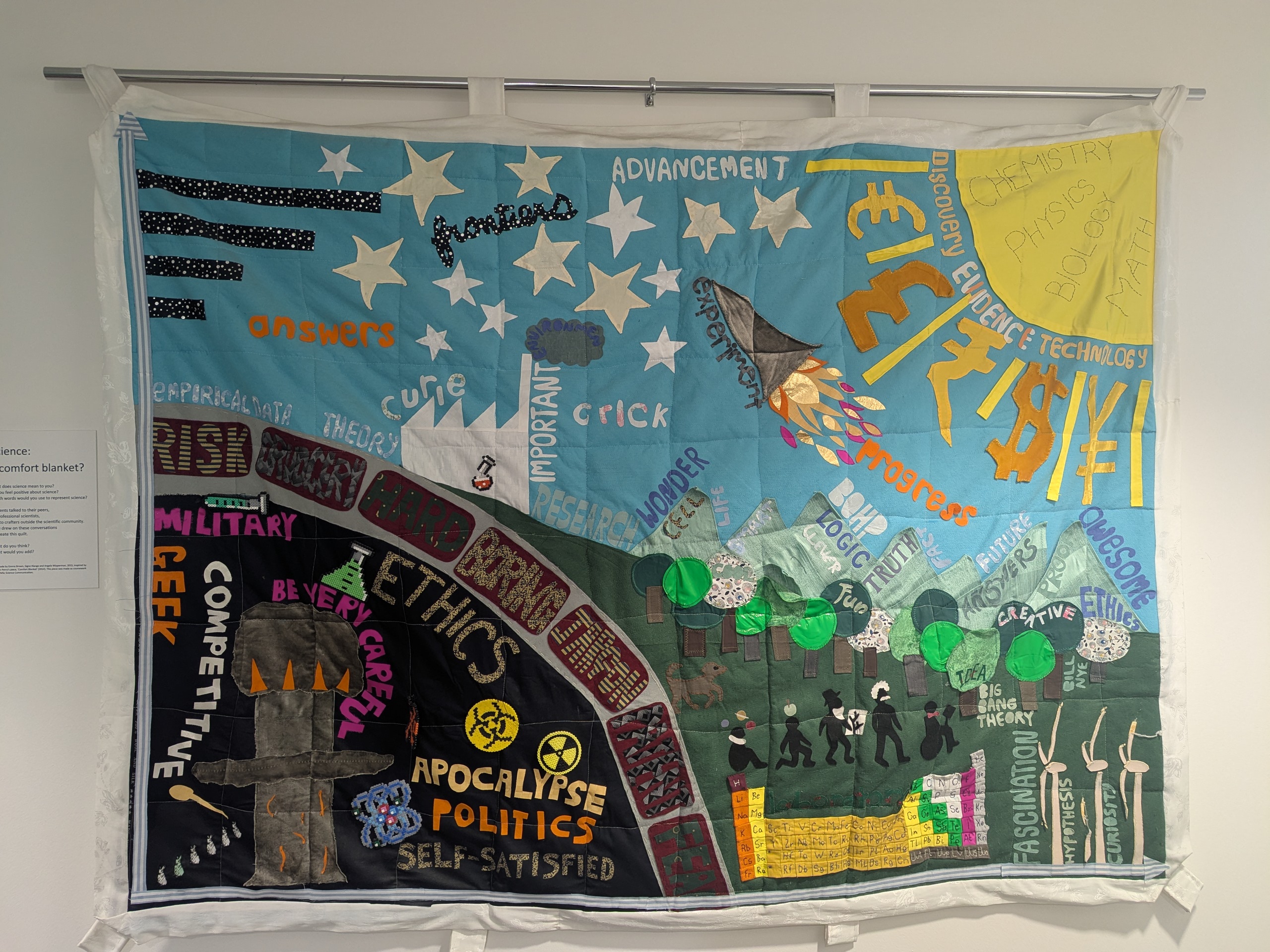 The quilt was made by Emma Brown, Signe Klange and Angela Wipperman, 2015, inspired by Grayson Perry's piece 'Comfort Blanket' (2014). It was made as coursework for the MSc Science Communication and you can find it on level 1 of the library opposite the Assistive Technology Room.