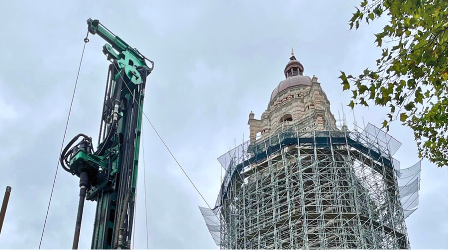 Drilling equipment erected on the Queen's Lawn to facilitate the borehole, with the Queen's Tower in the background. Photo: Imperial.