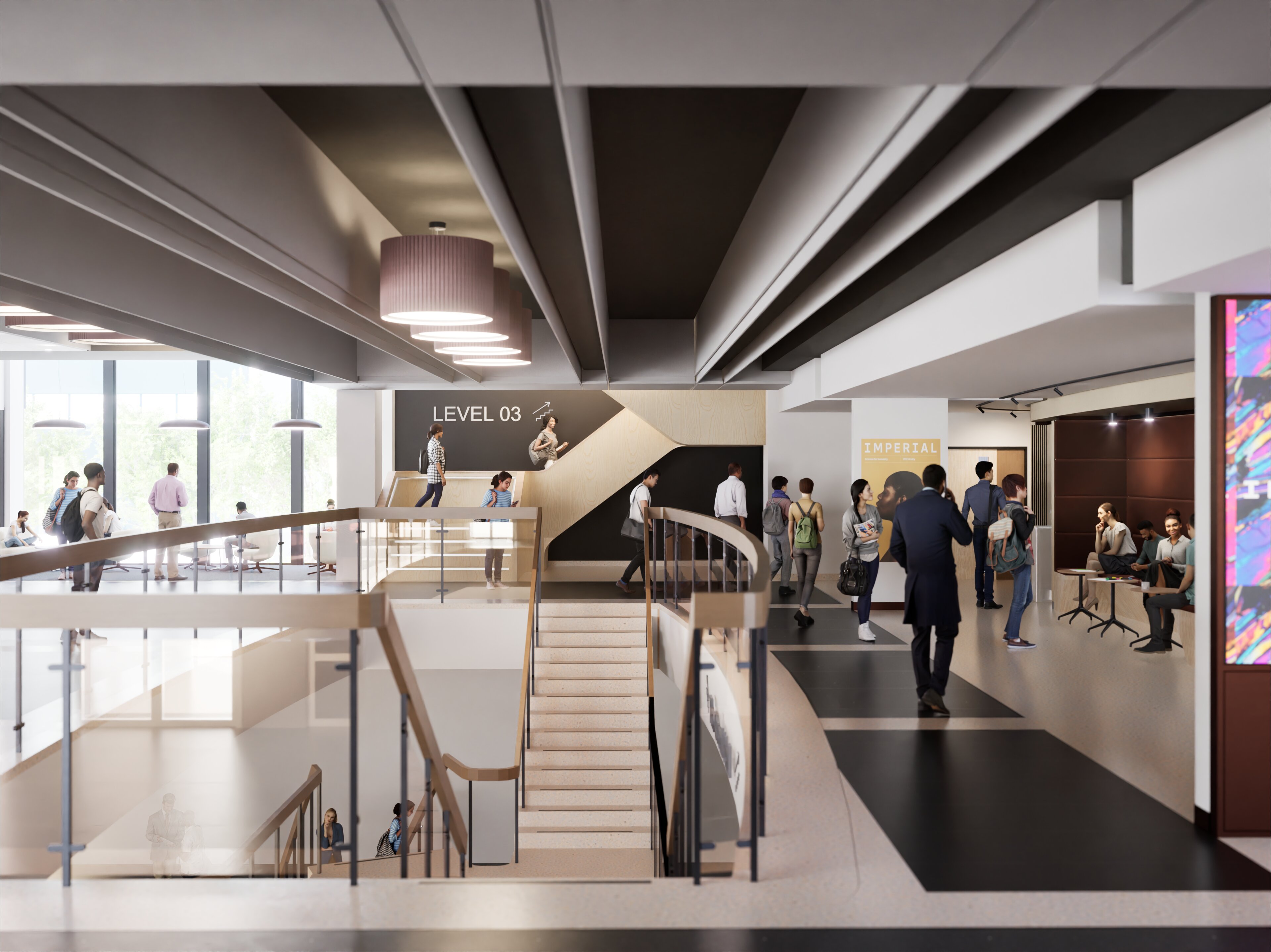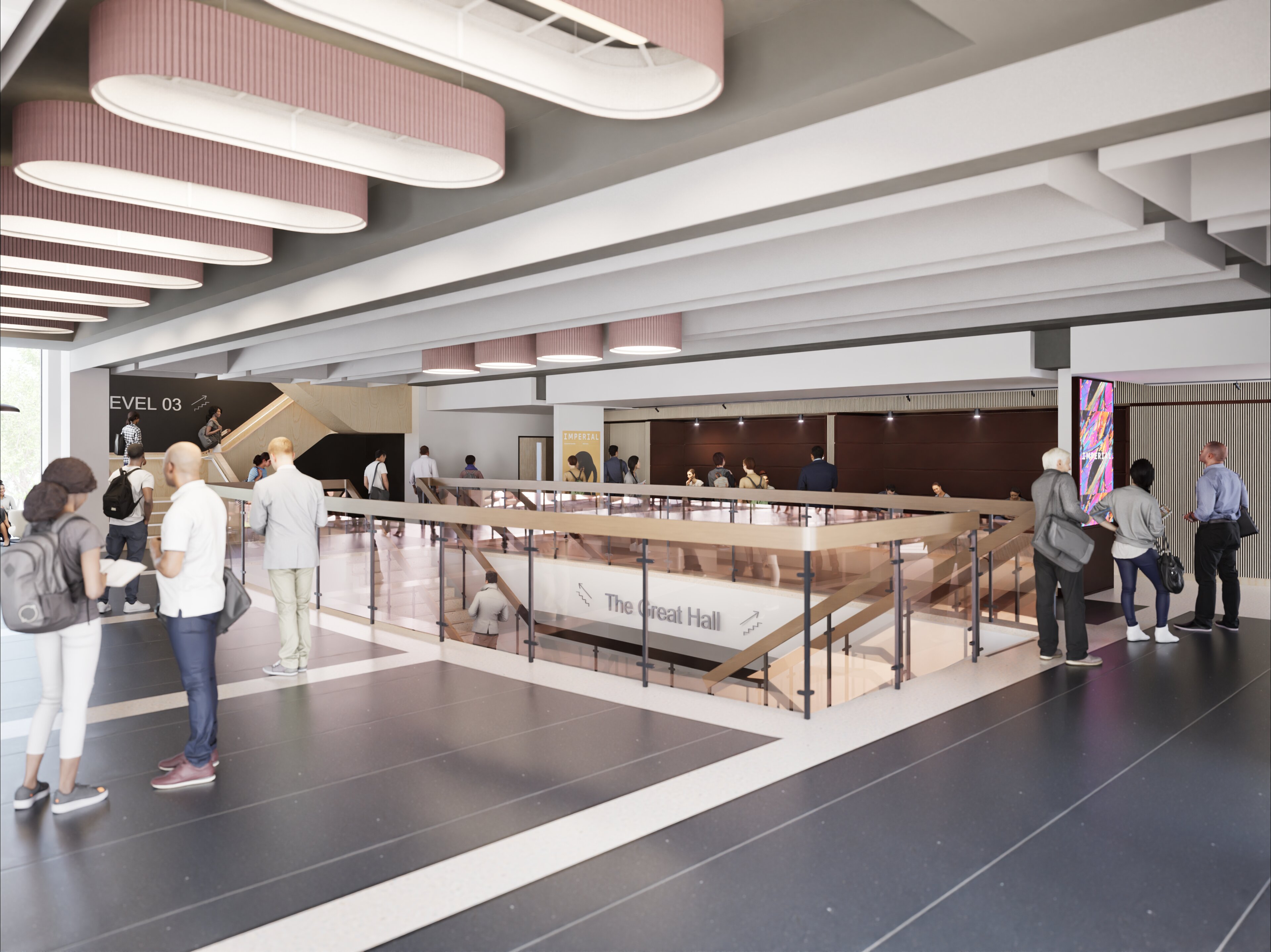 The area behind the Great Hall will be upgraded with booth seating, tables and information screens on levels two and three. The circulation area on level three will be reorganised to provide more space and better connection to level two, as well as more natural light.