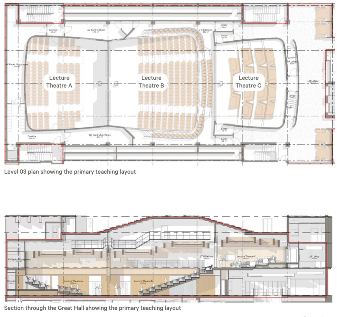 The lecture theatres will have a capacity of 140-266, and have retractable seating to allow for other uses. When in large event mode (seated) the Great Hall will have a capacity of 584.