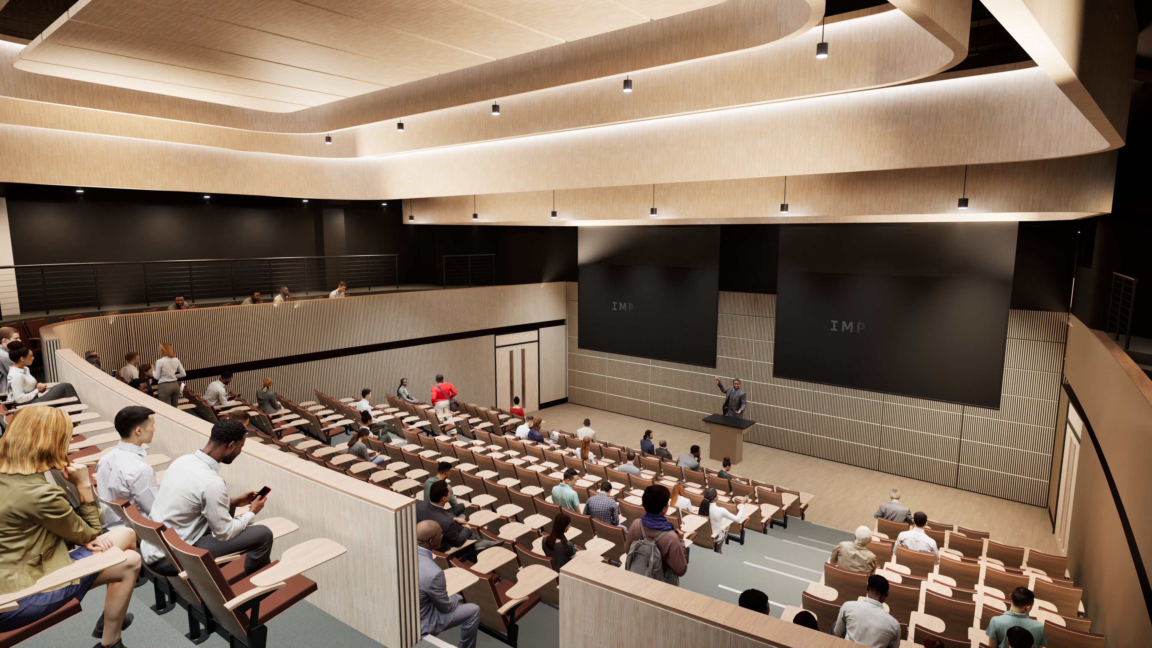 An artist's impression of the Great Hall theatres A and B in lecture mode.