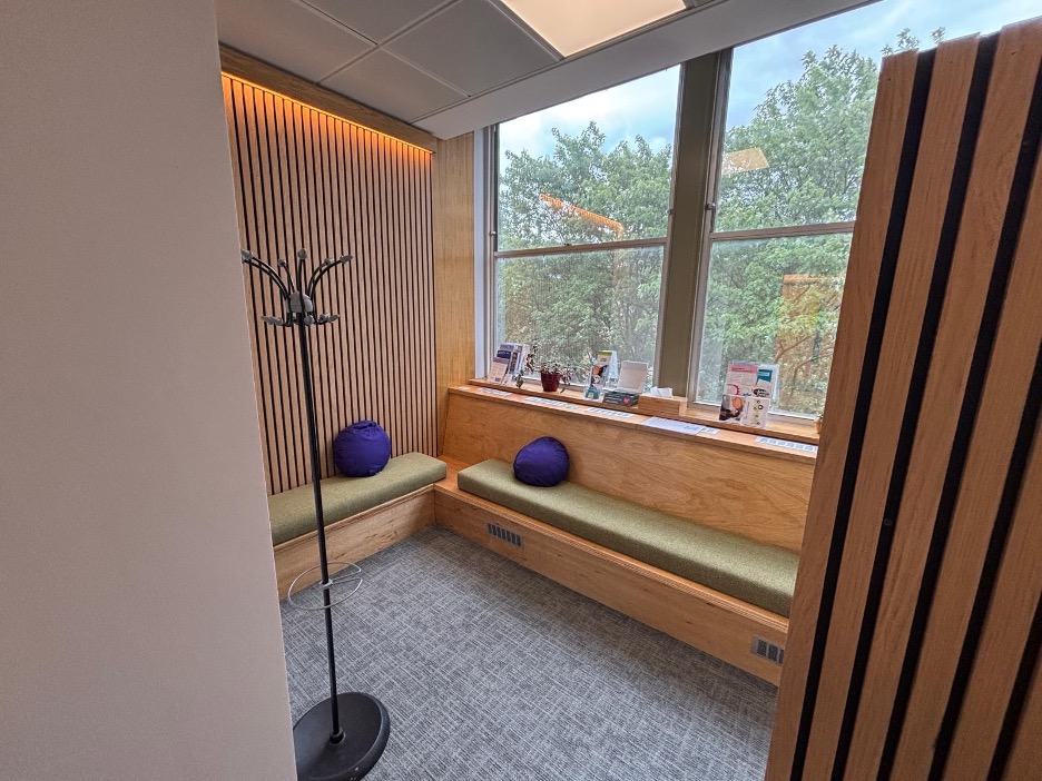 - Furniture retention: Furniture was almost entirely reused, combining items from the Living Lab with selected pieces from the former counselling service, including a reupholstered green bench now repurposed for the new space.