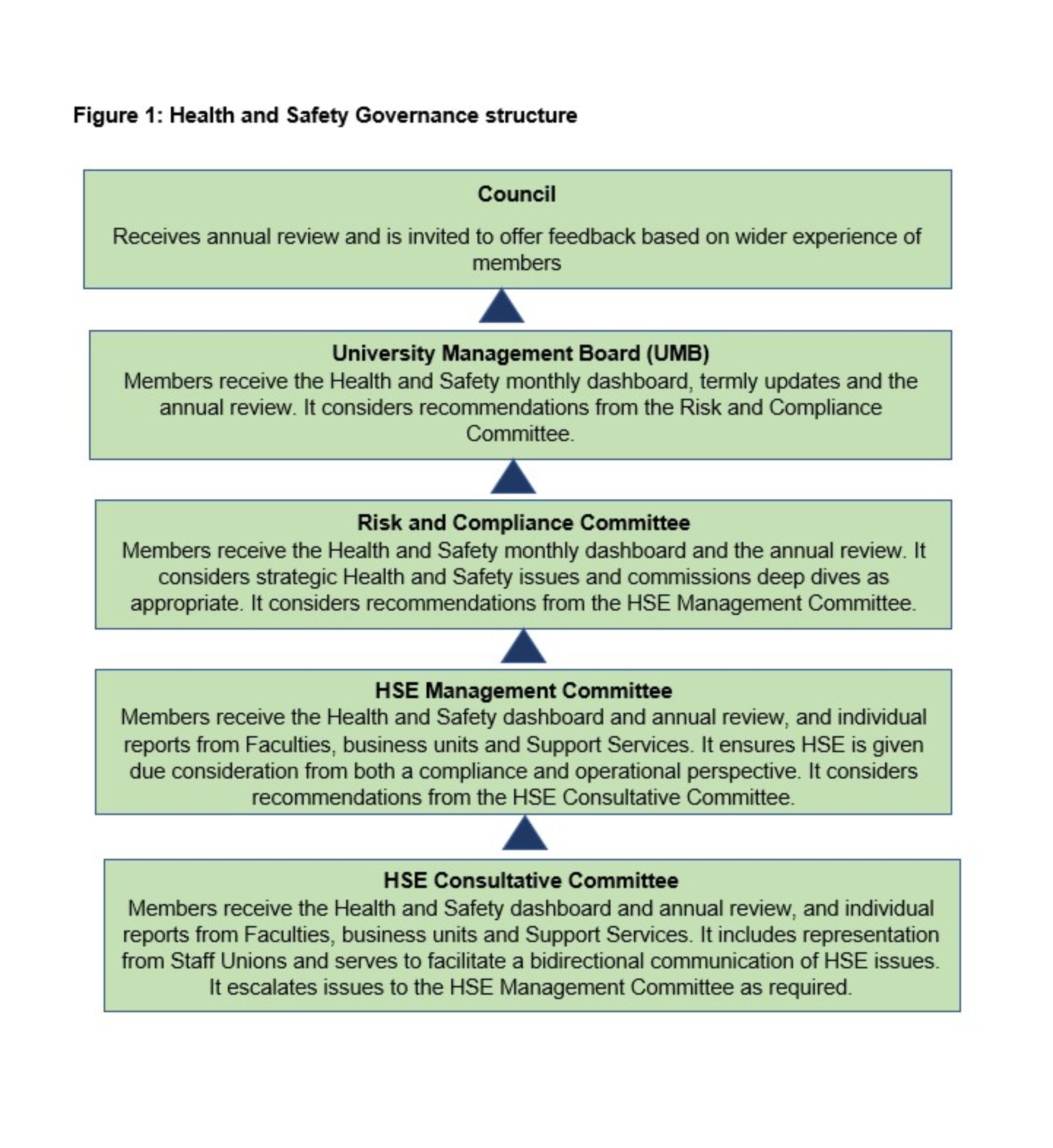 - Annual report on safety, fire, health, and wellbeing is presented and discussed at the University Management Board, the Audit and Risk Committee of Council and sent to Council.