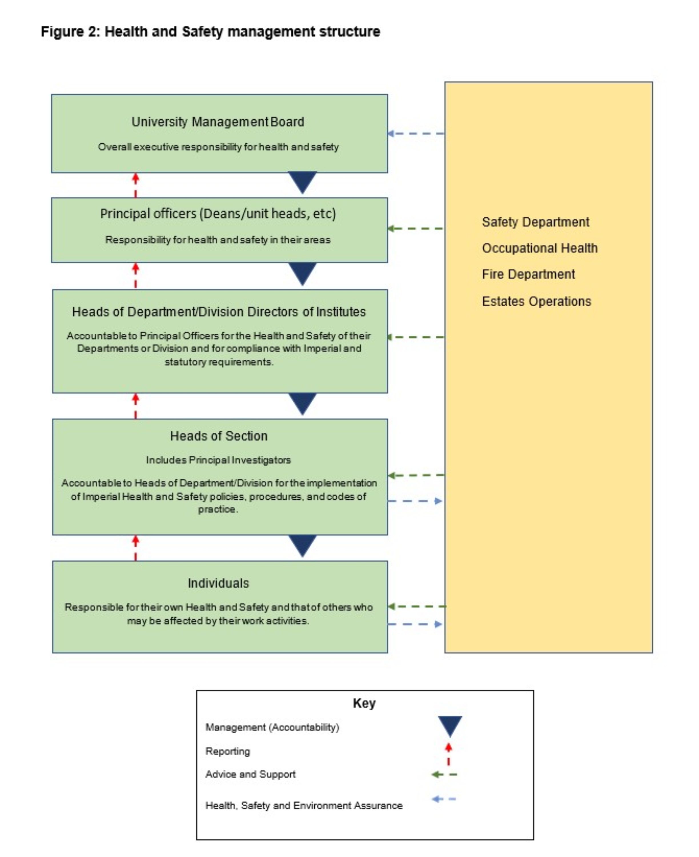 Imperial has defined Health and Safety governance and management structures (figures 1 & 2) and oversight from the Council, to ensure that the University meets its duties of care, regulatory and legal requirements relating to Health and Safety. Each of these bodies regularly reviews performance, compliance, incidences, and risks, in accordance with their annual patterns of work.