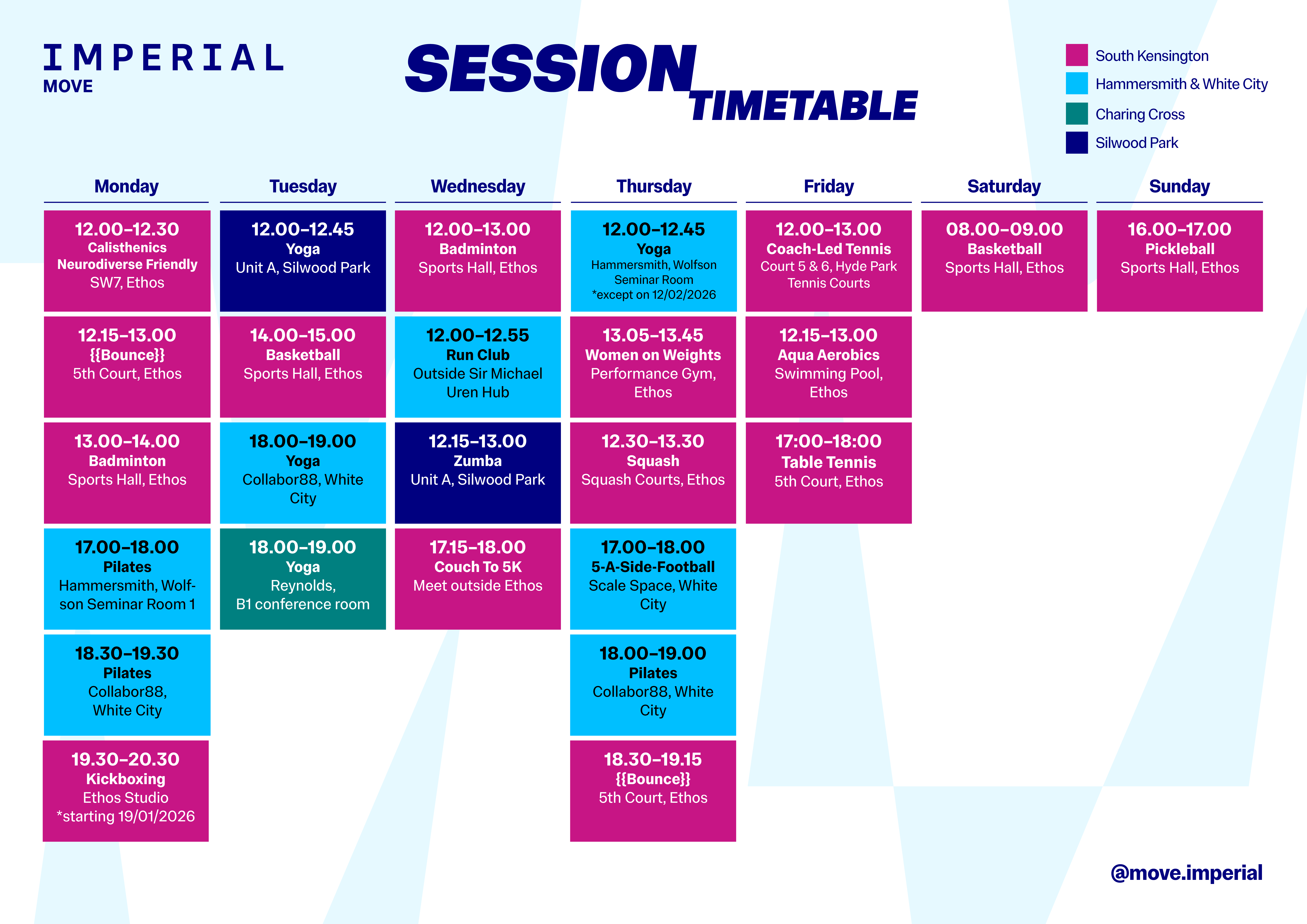 Just Move activities are different to those you would find in a regular gym membership and are designed for people who want to get more physically active in a fun and alternative way. All Imperial students and staff have free access to all Just Move classes and sessions. Sessions don't require pre-booking – just turn up ready to move your body. Plus, we have activities across campuses so wherever you are, you can get involved!