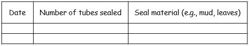 You may notice that bees will seal up the entrance to a tube once they have laid their eggs in it. You can record how many tubes are sealed, and the material they have been sealed with, for example: