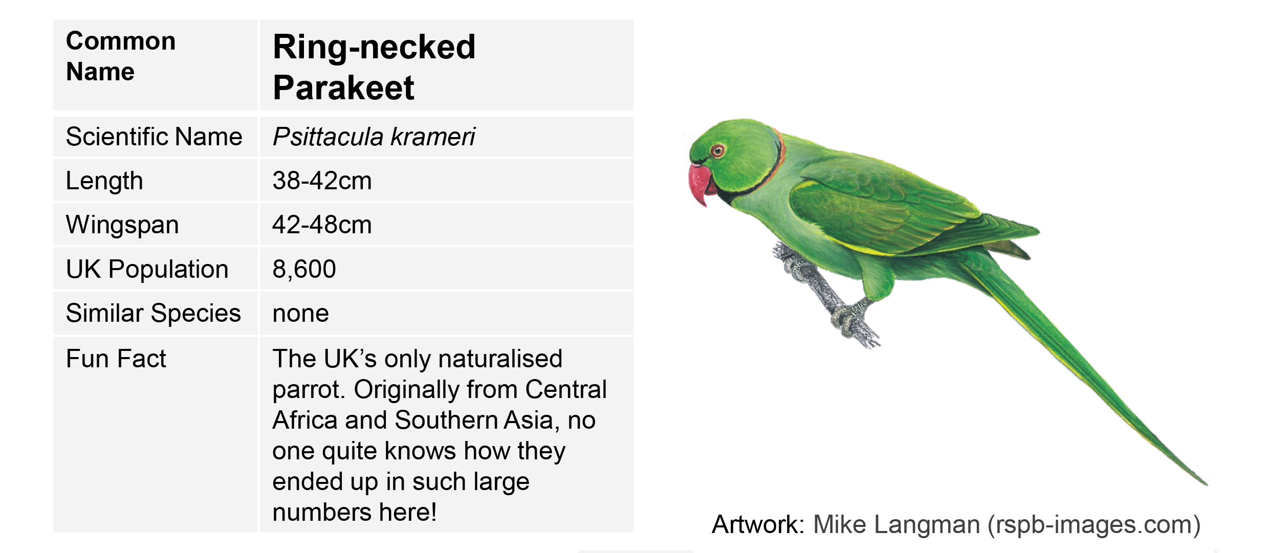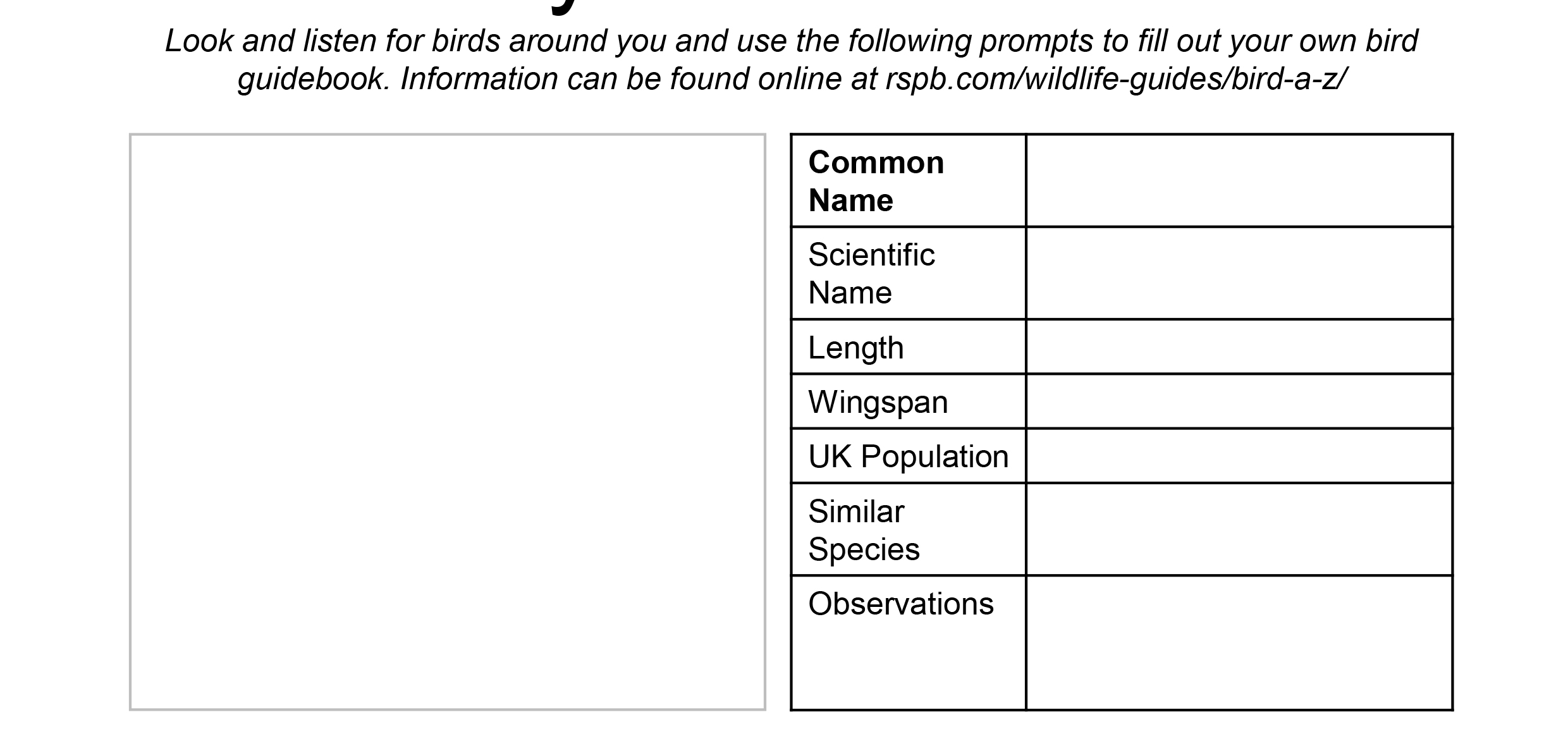 - If you can’t: have a look in a bird handbook or check https://www.rspb.org.uk/birds-and-wildlife/wildlife-guides/identify-a-bird/ and fill in the new species in your notebook/bird guide.