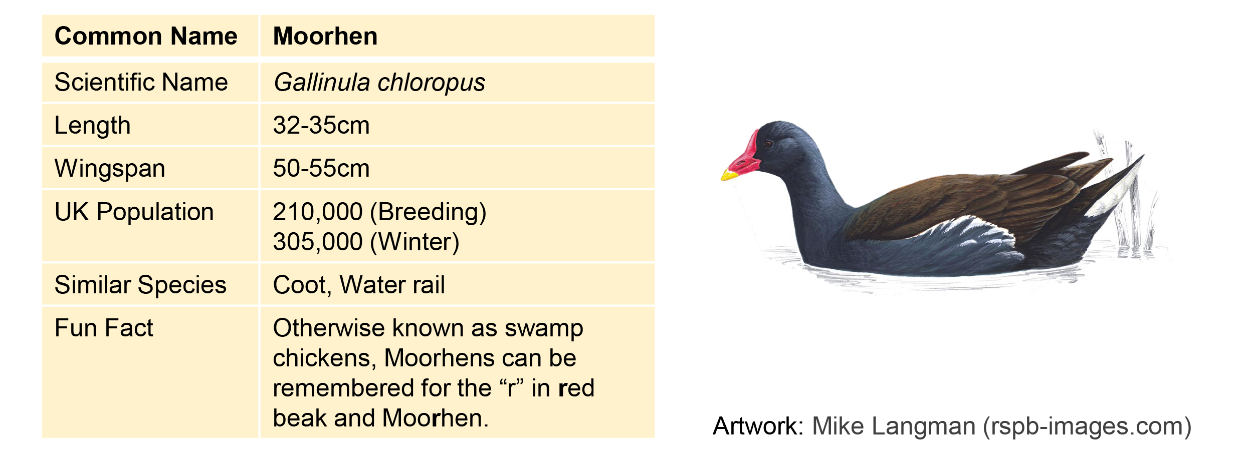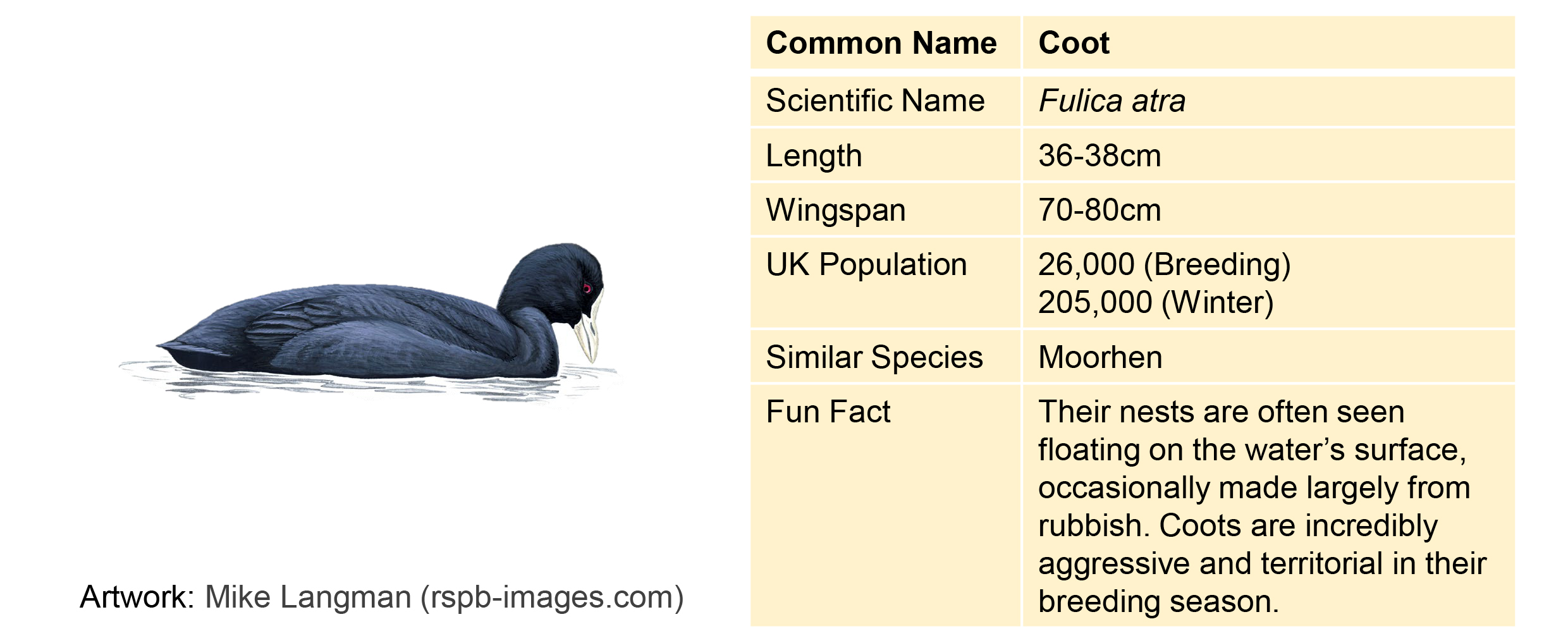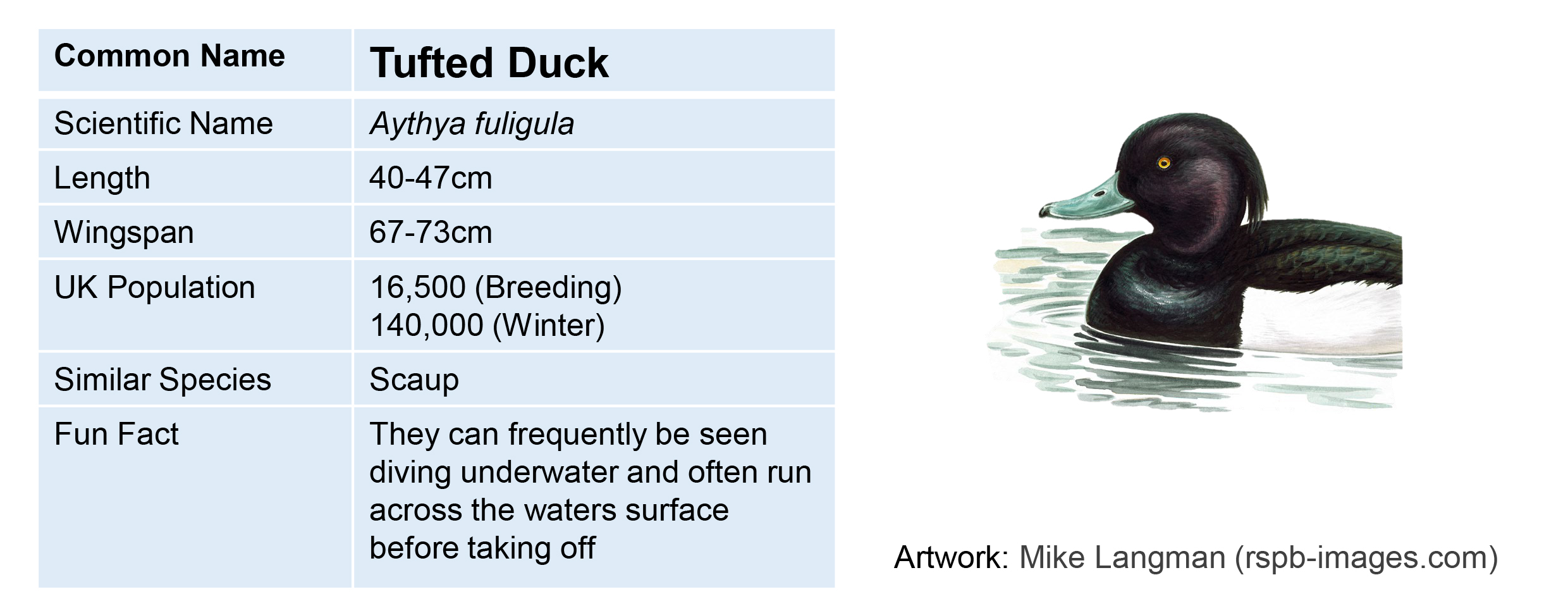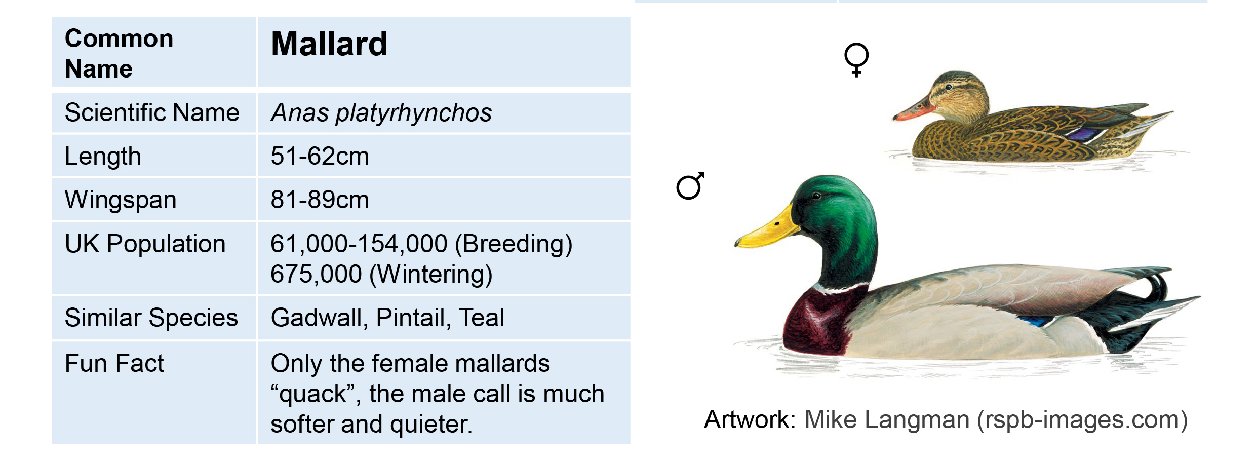 Bird looks similar but not the same as your guide? – sometimes male and female birds of the same species look different. This is known as “sexual dimorphism”. Sometimes it’s subtle, such as tufted ducks where the female is greyer and has a much shorter tuft, and other times it’s more extreme such as mallards. Check a handbook or the internet if you want to find out more. Another thing to consider is whether the bird you’re looking at could be young. Young birds tend to be fluffier and greyer than their parents, sometimes they look completely different. You will mostly notice young birds and chicks in summer – so look out for who they seem to be following.